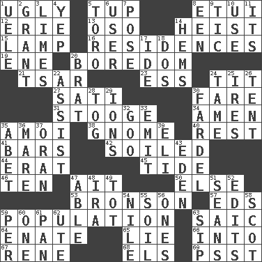 ACROSS 1. Repulsive 5. Uncastrated adult male sheep 8. Needle holder 12. One of the Great Lakes 13. Bear (Spanish) 14. Robbery 15. Desk light 16. Homes 19. Compass dir. 20. Mood resulting from idleness 21. Russian ruler of old 23. Curvy letter 24. Teat (slang) 27. Suttee (variant) 30. Conductor's collection 31. Moe Howard, for one 34. So be it 35. Mine, in Marseilles 38. Dwarf 40. Relief 41. Drinking establishments 42. Dirtied 44. Part of Q.E.F. 45. Event that recurs at intervals 46. "___ Little Indians" 47. Small island 50. Otherwise 53. "Death Wish" actor 57. Begley and Asner 59. Census information 63. Ketch in the Levant 64. Related on the mother's side 65. Untruth 66. To the inside or interior of 67. French philosopher Descartes 68. Raised railways 69. Inconspicuous attention getter DOWN 1. Ubangi River tributary 2. Let have 3. Citrus fruits 4. Slangy assent 5. "Corrida" creature 6. One who uses or employs something 7. Airs 8. Car or cant ending 9. Nervous spasm 10. Purpose 11. ___ a Wonderful Life 14. Is hesitant and indecisive 17. Binary compound 18. Two (Sp.) 20. Naughty child 22. Help 24. Not wild 25. Angers 26. Portable shelter 28. Coat; cloak 29. Charged atoms 30. Bundle 32. Thick or sticky substance 33. Send forth 35. Collude with 36. Female horse 37. NW Algerian seaport 39. Biblical high priest 43. Paradise 47. Competent 48. Lyricist Gershwin 49. Small child 51. Seines 52. Prepares for publication 54. "Death on the ____" 55. Earth 56. Washington bills 58. Highlander 59. For each 60. Single 61. Baking dish 62. Shoshoni 63. Small drink
