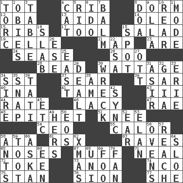 ACROSS 1. Small child 4. Baby bed with high sides 8. Dormintory (informal) 12. Chief or king in Benin or Nigeria 13. Opera by Verdi 14. Butter sub 15. Chest bones 17. Implement 18. Vegetable dish 19. Cell (Danish) 21. Atlas unit 23. "We ___ not amused" (Victoria) 24. Gospel singer Marvin 26. "Barney Miller" actor Jack 28. Necklace unit 30. Electrical Measurement 34. Fast jet (abbr.) 37. Singe 39. Russian ruler of old 40. _ tizzy (2 wds.) 41. Softens 43. One more than two 44. Assign a rank or rating to 46. Made of lace 47. Actress Charlotte 48. Curse 51. Leg joint 54. Corporate head (abbr.) 55. Bodily heat indicating an inflammation 58. _ moment's notice (2 wds.) 61. Acura sports coupe 63. All-night dance parties 65. Olfactory organs 67. Perform or handle clumsily 71. Actress Patricia 72. Casino tip 73. Small Philippine buffalo 74. Non-commissioned officer (abbr.) 75. Comedian Laurel of Laurel & Hardy 76. The Jewish people; Israel 77. A female animal or person DOWN 1. Torque (variant) 2. Off-Broadway awards 3. Eating place 4. Domesticated feline 5. River (Sp.) 6. Wedding promise 7. Lip ointment 8. ___ good deed 9. Water jar 10. Tail end 11. Method 16. Thick slice 18. Blemish 20. Compass dir. 22. White ___ sheet 25. 90 degrees 27. Baseball player Mel 29. Started a card game 30. Raze 31. SW Saudi Arabia district 32. Greek goddess of the earth (variant) 33. One of the Great Lakes 34. Title for a man of rank and authority 35. Fastener 36. Jacques of French films 38. Wet nurse (var.) 42. Synchronize (abbr.) 45. And so on (abbr.) 49. Possessive pronoun 50. Greek goddess of the dawn 52. Ewer handle 53. Flair 56. Baking chambers 57. Arrive at 58. Pismires 59. A blast of a horn 60. "____ silly question..." 62. Dec. holiday 64. A type of plum 66. Car or cant ending 68. Corn or form start 69. Egg _ yung 70. Air blower