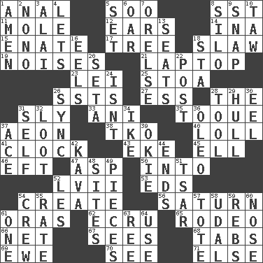ACROSS 1. Of or related to the anus 5. "Barney Miller" actor Jack 8. Fast jet (abbr.) 11. Undercover agent 12. Hearing organs 14. _ tizzy (2 wds.) 15. Related on the mother's side 17. Family _ (genealogy) 18. Cole _ (cabbage dish) 19. Annoying sounds 21. Portable computer 23. Flowery wreath 25. Portico 26. Fast planes 27. Curvy letter 28. Definite Article 31. Wily 33. Cuckoo 35. Woman's close-fitting hat 37. Age 38. Ring climax 40. Hang loosely or laxly 41. Timepiece 43. Make supply last 45. Pipe bend 46. Bank Draft (abbr.) 47. Viper 50. To the inside or interior of 52. 57 in ancient Rome 53. Begley and Asner 54. Make 56. Titan orbits this 61. Mouths or openings 62. Shade of tan 65. Cowboy competition 66. Fish or hair follower 67. Observes 68. Bar bills 69. She-sheep 70. Perceive with the eye 71. Otherwise DOWN 1. So be it 2. Words to Nanette 3. Jai ____ 4. Allows 5. Put into a specified state 6. Boat paddle 7. Threatening words 8. Grain storage tower 9. Fastener 10. The 23rd letter of the Hebrew alphabet 13. Theater features 16. Snakelike fish 18. R.R. building 20. Bristle 22. Mail 24. Is not 26. Synchronize (abbr.) 28. Utensil 29. Frame or body of a ship 30. Snakelike fish 31. Itself 32. Plunder 34. Mamie's mate 36. Butter sub 37. Adept person 39. Migrant worker of the '30s 42. Polynesian shrub of the pepper family 44. Extremities 48. Settings 49. Parts 51. Russian ruler of old 52. French article 54. Ship's personnel 55. Assign a rank or rating to 57. Carry 58. Hereditary estate 59. Confederate soldiers (slang) 60. Olfactory organ 61. Single 63. Portuguese money of account (variant) 64. Purpose