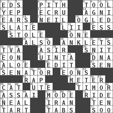ACROSS 1. Begley and Asner 4. Heart or essence 8. Instrument 12. Slangy assent 13. Shade of tan 14. Hindu god of fire 15. Hearing organs 17. Famous astronaut Armstrong 18. Stared 19. Schedule 21. Cards in a Roman deck? 23. Curvy letter 24. Took without asking 26. Single 28. In addition 30. Short socks 34. Federal power corp. 37. SW Saudi Arabia district 39. In a ____ (agitated or irritated) 40. Age 41. National forest in Provo, Utah 43. Heredity factor (abbr.) 44. Medicinal plant 46. Prepare for publication 47. Elected rep. 48. Elected representative 51. Immeasurably long periods of time 54. Hit sharply and swiftly 55. Distance measurement 58. Domesticated feline 61. Shoshoni 63. Southeast Indonesia island 65. Slender Brazilian palm 67. Method 71. Travel on or in a vehicle 72. Actress Patricia 73. SW Asia republic 74. "___ Little Indians" 75. Small pie 76. Bar bills 77. "Barney Miller" actor Jack DOWN 1. Snake ____ (dice throw) 2. Allots cards 3. Small fatty European fish 4. Fenced enclosure 5. Frozen water 6. Three (prefix) 7. Frame or body of a ship 8. Label 9. Stare at amorously 10. Singles 11. Hats (slang) 16. Portico 18. Pig sound 20. Pipe bend 22. Electrically charged atom 25. Son of Isaac 27. Raised railways 29. Flexible twig of a willow tree 30. Nick name for Arthur 31. Extremities 32. Prong on a fork 33. Comedian Laurel of Laurel & Hardy 34. Afternoon social gatherings 35. Grand slam 36. Soon (poet.) 38. Indiana (abbr.) 42. Smallest unit of an element 45. Ewer handle 49. "Change" in Tahitian 50. Elect 52. Fish or hair follower 53. Use a swizzle stick 56. Sends forth 57. Cowboy competition 58. Patter 59. Toward the sea 60. Russian ruler of old 62. Send forth 64. Former U.S. Attorney General Janet 66. The first octave above the treble staff 68. Mouth or opening 69. Apply (a substance) by light strokes 70. Followers of ems