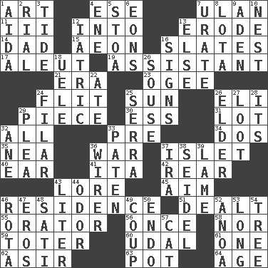 ACROSS 1. Tate display 4. Compass dir. 7. ____ Bator 11. One more than two 12. To the inside or interior of 13. Eat (away) 14. June honoree 15. Age 16. Chalkboards 17. Eskimo relative 19. Helper 21. Epoch 23. Double curve, resembling the letter S 24. Secret move to avoid paying debts 25. Player for Phoenix 26. Biblical high priest 29. Component 30. Curvy letter 31. Car dealer's back yard 32. 100% 33. Before (prefix) 34. Two (Sp.) 35. Teachers' org. 36. Armed conflict 37. Small island 40. Hearing organ 41. Call ___ day 42. Bring up, as a child 43. Old wives' tales, e.g. 45. Direct toward a target or goal 46. Dwelling 51. Started a card game 55. Speaker 56. Single time 58. Or not 59. Carrier 60. Hereditary estate 61. Single 62. SW Saudi Arabia district 63. Cooking vessel 64. Grow older DOWN 1. Opera by Verdi 2. Monetary unit of Yemen 3. Periodic rise and fall of the sea level 4. Compass dir. 5. Portico 6. Immeasurably long periods of time 7. A salt of uric acid 8. Globular water bottle used in Asia 9. Arabian gulf 10. A home for chicks 12. Of or pertaining to medicine 13. Otherwise 16. Signals 18. Ubangi River tributary 20. Boozer 22. Had dinner 24. Having threads 25. Father Junipero _ 26. A person who is older than you are 27. Plunder 28. ___ a Wonderful Life 29. Entreaty 32. One (Scot) 33. Eucharist need 36. One who wires 37. Retirement account (abbr.) 38. Beer mug 39. Unable to walk 43. 61 cubic inches 44. Scent 46. Round or rotation of duties 47. Greek god of love 48. Suttee (variant) 49. Overturn; upset 50. Inside; within (prefix) 52. Small Philippine buffalo 53. Yearn 54. Woody plant 57. Feline
