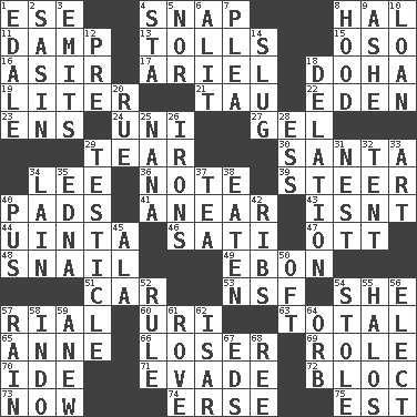 ACROSS 1. Compass dir. 4. Fastener 8. Actor Linden 11. Moist 13. For Whom the Bell _____ 15. Bear (Spanish) 16. SW Saudi Arabia district 17. Satellite of Uranus 18. Capital of the state of Qatar 19. 61 cubic inches 21. The 19th letter of the Greek alphabet 22. Genesis locale 23. Followers of ems 24. University (slang) 27. Set 29. Separate forcefully 30. Before Barbara or Clara 34. Area sheltered from the wind 36. Short letter 39. Navigate 40. Writing tablets 41. Approach 43. Is not 44. National forest in Provo, Utah 46. Suttee (variant) 47. Baseball player Mel 48. Slow-paced one 49. Inky black, to poets 51. 4-wheeled motor vehicle 53. Overdraft (abbr.) 54. A female animal or person 57. Monetary unit of Yemen 60. RI univ. 63. "_____ Recall" 65. Singer Murray 66. Failure 69. Hero or heavy, e.g. 70. Binary compound 71. Dodge 72. Coalition 73. Immediately 74. Celtic language 75. Eastern Standard Time (abbr.) DOWN 1. Peak District village in England 2. Indian antelope 3. Gives off 4. R.R. building 5. Or not 6. Set down 7. Entreaty 8. Parka part 9. American tennis player Robert 10. Grant temporary use of 12. Before (prefix) 14. Strike heavily 18. Accusation by an informer 20. Sorrow 25. Nanny 26. Removes the wrinkles 28. Curvy letter 29. One of the two male reproductive glands 31. Egg locale 32. Portable shelter 33. Nonscientific branch of learning 34. (Had) reclined 35. Pulitzer Prize-winning author Ferber 37. Afternoon social gathering 38. Ingested 40. Ichor 42. Teases 45. Wing 50. Often (poetically) 52. Court order 54. Took without asking 55. Saint headwear 56. Opt 57. Water falling in drops from the sky 58. Southeast Asian peninsula 59. Afresh 61. Be footloose 62. Austrian river, tributary to the Danube 64. Globe 67. Begley and Asner 68. To sift