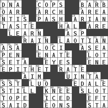 ACROSS 1. Heredity factor (abbr.) 4. 911 reaches them 8. Sharp remark 12. Boat paddle 13. Bowlike part 14. Length times width 15. Nuclear Threat Initiatives 17. Romantic infatuation 18. Believer in; advocate of (suffix) 19. Clothes sense 21. Actor Linden 23. "We ___ not amused" (Victoria) 24. Acquire or gain knowledge or skills 26. Viper 28. Precipitation 30. Of or relating to Laos or its people 34. White ___ sheet 37. Venues 39. Toward the sea 40. Writing instrument 41. Related on the mother's side 43. Car dealer's back yard 44. Stalk of a moss capsule 46. Snake ____ (dice throw) 47. Compass dir. 48. Curse 51. Assign a rank or rating to 54. Direct toward a target or goal 55. National forest in Provo, Utah 58. Fast jet (abbr.) 61. Nilotic language 63. Peak District village in England 65. Free from disturbance or agitation 67. Leg joint 71. Notch 72. Drink excessively 73. On the rocks 74. Newt 75. Expressed in words 76. Immeasurably long periods of time 77. R.R. building DOWN 1. Do not 2. Brizilian seaport 3. Originate 4. Head covering 5. Mouth or opening 6. Personal Computers (abbr.) 7. Quiet! 8. Tavern 9. Operatic vocal solo 10. Stern 11. Object of repulsion 16. Play the lead 18. In addition 20. Period 22. American Automobile Association (abbr.) 25. Mediterranean tributary 27. Parent Teacher Assoc. 29. Music written for nine 30. 61 cubic inches 31. Small island 32. Period of immesurable duration 33. Nathan's nickname 34. Domed church section 35. Ooze 36. Against 38. Island 42. He sold his birthright 45. "One Day ___ Time" 49. Land elevation 50. Australian flightless bird 52. Make a knot 53. Extremities 56. Lies 57. At or to great height 58. Fast planes 59. Portico 60. Native american tent (variation) 62. Migrant worker of the '30s 64. Singer James 66. Directed 68. Non-commissioned officer (abbr.) 69. Car or cant ending 70. Begley and Asner