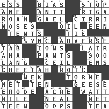 ACROSS 1. Double-curved letter 4. Prejudice 8. Cease 12. One (Scot) 13. Against 14. Port city in Latvia 15. Wander aimlessly 17. Highlander 18. High-altitude cloud 19. Olfactory organs 21. Lubricate 23. Car or cant ending 24. Portable shelters 26. Make a knot 28. Synchronize (abbr.) 30. Contrary to your interests or welfare 34. Bar bill 37. Charged atoms 39. Den 40. Nanny (var.) 41. Leg coverings 43. "Barney Miller" actor Jack 44. Long (Scottish) 46. To provide with a ceiling 47. Followers of ems 48. Leopard's kin 51. College mil. group 54. ___ Haven, CT 55. Singer Mel 58. Soggy 61. "___ Little Indians" 63. Honkers 65. Eat (away) 67. Measure of real estate 71. Electrical Unit 72. The longest river in the world 73. Be tempered by heat 74. Fish or hair follower 75. Adolescent 76. I made a mistake 77. Beverage made from leaves DOWN 1. Merit 2. Snob 3. Gospel singer Marvin 4. Paper or plastic container 5. _ tizzy (2 wds.) 6. Had dinner 7. Grain storage tower 8. Indian title of respect (Mr.) 9. Become fatigued 10. Legendary monster 11. Ache 16. Not women's 18. 154 in Roman numerals 20. Filthy place 22. It would 25. Clip 27. Snakelike fish 29. Team commander 30. Moving or stirring 31. Raze (variant) 32. The Jewish people; Israel 33. Greek god of love 34. Baby powder 35. Wet nurse 36. Object of repulsion 38. Compass dir. 42. Notch 45. Commissioned military rank (abbr.) 49. Wig 50. Deep reverence 52. Coat; cloak 53. Group working together 56. Intended 57. First name in cosmetics 58. Left 59. 4th largest of the Great Lakes 60. Lacquered or enameled metalware 62. Billionth: prefix 64. Singer James 66. Lair 68. Corporate head (abbr.) 69. Hit sharply and swiftly 70. Raised railways