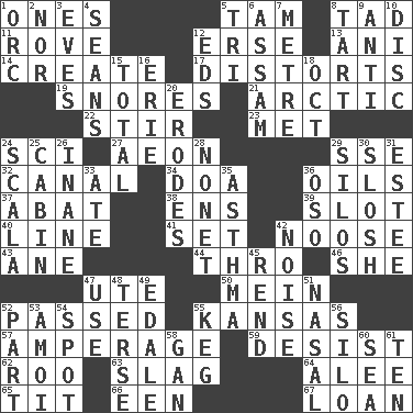 ACROSS 1. Washington bills 5. Scottish cap 8. Small boy 11. Be footloose 12. Celtic language 13. Cuckoo 14. Cause to be 17. What propaganda does 19. Sounds asleep 21. Northern region 22. Agitate 23. Was introduced to 24. _-fi 27. Age 29. Compass dir. 32. Lessep's creation 34. ___ good deed 36. Lubricates 37. Blind as ____ 38. Followers of ems 39. Notch 40. Actor's bit 41. Arrange properly for use 42. Trap for birds or small mammals 43. One (Scot) 44. Through, poetically 46. A female animal or person 47. Shoshoni 50. Chow _ 52. Went by 55. Sunflower state 57. Electrical Measurement 59. Cease 62. Friend of Pooh 63. Volcanic refuse 64. Toward shelter 65. Teat (slang) 66. Car or cant ending 67. Grant temporary use of DOWN 1. The grampus (Milton) 2. Not either 3. Nights before holidays 4. Actors Connery and Penn 5. Three (prefix) 6. Indian state 7. Distance measurement (Brit.) 8. Small pie 9. Opposed to 10. Flat circle 12. Begley and Asner 15. Add up to 16. 4th largest of the Great Lakes 18. Sep. follower 20. Eats (away) 24. Any of the three canals of the cochlea 25. Apartment or room in a ship 26. Lacking in sense or substance 28. Music written for nine 29. Grain storage towers 30. Splash clumsily 31. First name in cosmetics 33. Had dinner 35. Respiratory problem 36. Bear (Spanish) 42. Annoying sound 45. Tear apart 47. Purpose 48. Laconic 49. Peak District village in England 51. Rhinal 52. Component 53. Mine, in Marseilles 54. Specific locale 55. Cask 56. Grain storage tower 58. Separate the seeds from cotton 60. Ocean 61. Nine, plus one