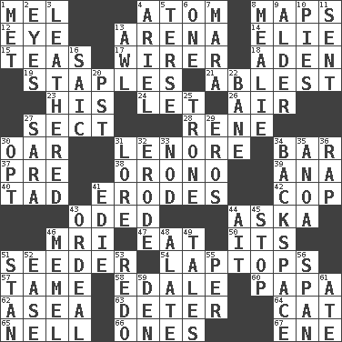 ACROSS 1. Cartoonist voice _ Blanc 4. Tiny particle 8. Atlas contents 12. Sight organ 13. Sports stadium 14. Writer Wiesel 15. Beverages made from leaves 17. One who wires 18. An important port of Yemen 19. Paper fasteners 21. Most capable 23. Part of HMS, perhaps 24. Allow 26. Wind 27. Religious group 28. French philosopher Descartes 30. Boat paddle 31. Poe poem 34. Soap unit 37. Before (prefix) 38. U. of Maine site 39. Santa ___, CA 40. Small amount or degree 41. Eats (away) 42. Police officer (slang) 43. Wrote a lyric poem 44. "____ silly question..." 46. Medical imaging device (abbr.) 47. Erode 50. ___ a Wonderful Life 51. Sowing specialist 54. Portable computers 57. Not wild 58. Peak District village in England 60. Dad 62. Toward the sea 63. Prevent from occurring 64. Feline 65. 1994 drama film starring Jodie Foster 66. Washington bills 67. Compass dir. DOWN 1. Was introduced to 2. Snake ____ (dice throw) 3. Tough but pliablecoriaceous 4. Satellite of Uranus 5. Laconic 6. Single 7. Hindu Mythology: god of death 8. Ear of corn 9. Tree or shrub in the Birch family 10. Sliced desserts 11. Emitted 13. Leather borer 16. Ketch in the Levant 20. Pacific Standard Time (abbr.) 22. Object of repulsion 25. Marketplace scale 27. "Two Mules for Sister ____" 29. Greek god of love 30. Choose 31. Old wives' tales, e.g. 32. Eat (away) 33. Allow head to fall sleepily 34. Keyboard key 35. Small Philippine buffalo 36. Reproach for some lapse or misdeed 41. Singer Brickell 43. Severe or trying experience 44. Small island 45. Constrict 46. Klaipeda city 48. Having winglike extensions 49. Stories 51. Comedian Laurel of Laurel & Hardy 52. Comfort 53. Do over again 55. For each 56. Connect, as a bridge 59. Lair 61. Had dinner