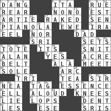 ACROSS 1. Mild oath, euphamism for damn 5. Call ___ day 8. Regret 11. Buttocks 12. Words to Nanette 14. Eastern Standard Time (abbr.) 15. Nick name for Arthur 17. Swept the length of 18. Elected rep. 19. Player piano 21. She-sheep 22. Lyricist Gershwin 23. Snakelike fish 24. Not either 25. Male parent 27. _ Lanka 28. Puts into a specified state 31. Carry 35. It is 37. In a ____ (agitated or irritated) 38. ____ Jay Lerner 39. Consenting reply 41. 1/640 square mile 42. Waist strap 43. According to 45. Rendezvous 46. Flatfish 47. Curve 49. Three (prefix) 51. Beverage made from leaves 52. Title for a knight 55. Teachers' org. 57. Label 60. Gist 62. Pipe bend 63. Verbally 65. Leg joints 66. Whopper 67. Chops off 68. Scratch 69. French article 70. Compass dir. 71. Indian titles of respect DOWN 1. Window treatment 2. Nest on high 3. Relating to or accompanying birth 4. Smile widely 5. _ tizzy (2 wds.) 6. Puff or smoke 7. Afresh 8. Dwelling 9. One who uses or employs something 10. Inactive volcano in Sicily 13. Wrote a lyric poem 16. Immeasurably long periods of time 17. Noteworthy scarcity 20. Australian parrot (variant) 26. Indian state 29. Become fatigued 30. Proofreading order 31. Bar bills 32. Margarine 33. Baron Munchausen's specialties 34. Keyboard key 36. Ocean 40. Scheduled 44. Ancient Greek god of war 48. Keg 50. Slanted text style (abbr.) 52. Contemptuous expression 53. Ancient Celtic tribe of eastern Britain 54. Musical pauses 55. 1994 drama film starring Jodie Foster 56. Writer Wiesel 58. Medicinal plant 59. Republicans 61. Conclusions 64. Purpose