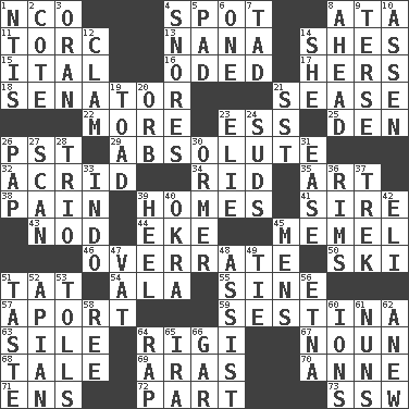 ACROSS 1. Non-commissioned officer (abbr.) 4. Specific locale 8. _ moment's notice (2 wds.) 11. Torque (variant) 13. Grandmother 14. "______ My Girl" (Turtles hit) 15. Slanted text style (abbr.) 16. Wrote a lyric poem 17. Possessive pronoun 18. Legislator 21. Gospel singer Marvin 22. Greater amount 23. Curvy letter 25. Lair 26. Pacific Standard Time (abbr.) 29. Utter; complete 32. Sour-tasting 34. To free from 35. Tate display 38. Ache 39. Residences 41. Father 43. Allow head to fall sleepily 44. Make supply last 45. Klaipeda city 46. Make much ado about nothing 50. What Jean-Claude Killy likes to do 51. Make lace 54. In the manner of 55. Trig term 57. To the left, to Queeg 59. French poetic form 63. Filth; sediment 64. Swiss mountan, "Queen of the Mountains" 67. Part of speech 68. Falsehood 69. Ancient river in northeast Turkey 70. Queen of England 1702-14 71. Followers of ems 72. Component 73. Compass dir. DOWN 1. Nuclear Threat Initiatives 2. ____ d'Azur (French Riviera) 3. Northwest Algerian city 4. Sounds asleep 5. Groovy apt. 6. Single 7. Bit 8. Having the leading position 9. Laconic 10. NE Netherlands city 12. Dollar (slang) 14. A female animal or person 19. Frog relative 20. Globe 21. Fast jet (abbr.) 23. Writer Wiesel 24. Soap bubbles 26. Infant food 27. Glance over 28. Musical group of three 30. Channel Islands abalone 31. Comfort 33. _ china 36. Basketball hoops 37. Long journey 39. Person who is morally reprehensible 40. Gumbo ingredient 42. Biblical high priest 45. Not women's 47. Large container 48. Help 49. Make a knot 51. Clothes sense 52. Bee-related 53. For Whom the Bell _____ 56. Inactive volcano in Sicily 58. To separate or throw off 60. Charged particles 61. Religious women 62. Afresh 64. Strike 65. Retirement account (abbr.) 66. Slender fish
