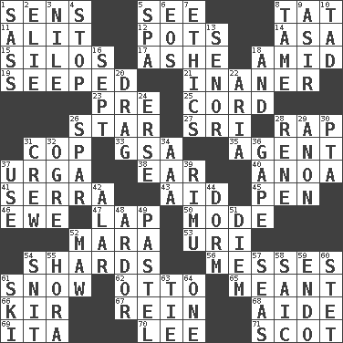 ACROSS 1. Elected reps. 5. Observe 8. Make lace 11. Set down 12. Cooking vessels 14. White ___ sheet 15. Grain storage towers 17. American tennis player Robert 18. Among 19. Oozed 21. Sillier 23. Before (prefix) 25. Drawstring 26. Play the lead 27. Indian title of respect (Mr.) 28. Reproach for some lapse or misdeed 31. Police officer (slang) 33. Girls' org. (abbr.) 35. Representative 37. Capital and largest city of Mongolia 38. Hearing organ 40. Small Philippine buffalo 41. Father Junipero _ 43. Help 45. Writing instrument 46. She-sheep 47. Infant locale 50. Method 52. Hindu Mythology: god of death 53. RI univ. 54. Broken pieces 56. Makes clutter 61. Overwhelm 62. "Beetle Bailey" pooch 65. Intended 66. Apertif with cassis 67. It's straight from the horse's mouth 68. Helper 69. Call ___ day 70. Area sheltered from the wind 71. Native of Scotland DOWN 1. Backtalk 2. Writer Wiesel 3. Mediterranean tributary 4. Cease 5. Health resort 6. Greek goddess of the dawn 7. Principles of right and wrong 8. Not wild 9. SW Saudi Arabia district 10. Small boy 13. Sir (Sp.) 16. Back-to-school mo. 18. Plus 20. To be drawn or hauled along 22. Operatic vocal solo 24. Celtic language 26. Coast Guard woman 28. French philosopher Descartes 29. Soon (poet.) 30. Parent Teacher Association (abbr.) 31. Ship's personnel 32. Legendary monster 34. Auto club (abbr.) 36. Open wide 37. Purpose 39. Tall New Zealand timber tree 42. Having or resembling wings 44. Dormintory (informal) 48. Zeal 49. Soft color 51. South Vietnam president (1954) 52. Informal term for the mouth 54. In a ____ (agitated or irritated) 55. Israeli folk dance 57. Oceans 58. Ketch in the Levant 59. Inside; within (prefix) 60. Proofreading order 61. What Jean-Claude Killy likes to do 63. Neckwear 64. Single
