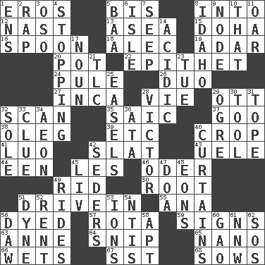 ACROSS 1. Greek god of love 5. Altar cloth linen 8. To the inside or interior of 12. Political cartoonist Thomas 13. Toward the sea 15. Capital of the state of Qatar 16. Soup utensil 18. Actor Baldwin 19. The sixth month of the Jewish calendar 20. Plant holder 22. Curse 24. Whimper 26. Superhero pair 27. South American Indian 28. Compete 29. Baseball player Mel 32. Skim 35. Ketch in the Levant 37. Thick or sticky substance 38. Cassini of fashion 39. And so on (abbr.) 40. Riding implement 41. Nilotic language 42. Narrow board 43. Ubangi River tributary 44. Car or cant ending 45. French article 46. Baltic tributary 49. To free from 50. Carrot, for example 51. Popular '50s hangout 55. Santa ___, CA 56. Colored 57. Roll call or roster of names 59. Public displays of written messages 63. Singer Murray 64. Sever or remove by pinching or nipping 65. Billionth: prefix 66. Moistens 67. Fast jet (abbr.) 68. Sty mamas DOWN 1. Followers of ems 2. Hit sharply and swiftly 3. Bear (Spanish) 4. Halting 5. Sound made by sheep 6. Capri or Wright 7. Ooze 8. Potato state 9. Thickened enlargement 10. Not this but _ 11. Rowing implement 14. Being or containing an acid 17. Part of speech 21. Affectionate concern, for short 23. Third day of the wk. 25. Artist's stands 28. Winning man's name 29. Legendary monster 30. Utensil 31. Drink excessively 32. Flatfish 33. A slight indication 34. Age 36. _ moment's notice (2 wds.) 40. Window treatments 42. Spring feasts 45. 54 in ancient Rome 47. ___ good deed 48. Immeasurably long periods of time 49. Amusement-park features 51. Unit of force 52. Monthly bill 53. Charged particles 54. Nuclear Threat Initiatives 56. Simpleton 58. Fitting 60. E Mali city 61. Compass dir. 62. Distress signal