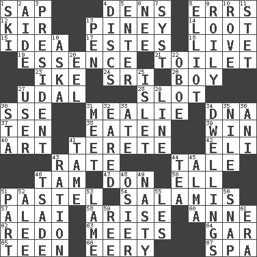 ACROSS 1. Plant excrement 4. Habitations of wild animals 8. Blunders 12. Apertif with cassis 13. Abounding in pines 14. Plunder 15. It may be bright or harebrained 17. _____ Park, CO 18. Not recorded 19. Center 21. Rest room 23. D.D.E's nickname 24. _ Lanka 26. Male child 27. Freehold land 28. Notch 30. Compass dir. 31. Ear of corn 34. Heredity factor (abbr.) 37. "___ Little Indians" 38. Ingested 39. Acquire through effort 40. Nonscientific branch of learning 41. Cigar-shaped 42. Biblical high priest 43. Assign a rank or rating to 44. Falsehood 46. Scottish cap 47. Spanish title 50. Pipe bend 51. Soft color 54. Deli grouping 57. Mountain range southwest of Kyrgyzstan 58. Get up 60. Queen of England 1702-14 62. Make new 63. Confronts 64. Slender fish 65. Adolescent 66. Suggestive of the supernatural 67. Health resort DOWN 1. What Jean-Claude Killy likes to do 2. Assistant 3. Elected leader of a country 4. Plates 5. Keyboard key 6. Born 7. System (abbr.) 8. American author Paul (1891-1958) 9. Agitated, as a liquid 10. Be footloose 11. Proofreading order 13. Animal enclosure 16. "____ silly question..." 20. Snakelike fish 22. Mitch Miller's instrument 25. Small island 27. One who makes use of a thing 29. Actor's bit 30. R.R. building 31. Confront 32. Having ears or earlike features 33. Had dinner 34. Homes 35. The longest river in the world 36. Cuckoo 41. Docile 43. Food allowance for one day 44. Afternoon social gathering 45. _ mater 46. Sadhe (variant) 48. Flexible twig of a willow tree 49. Difficult 51. Component 52. Toward shelter 53. Unable to walk 55. French article 56. Fastener 59. To separate or throw off 61. Epoch