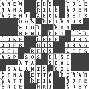 ACROSS 1. Afresh 5. Begley and Asner 8. Lacquered or enameled metalware 12. Nanny 13. Cause heat under the collar 15. Arabian gulf 16. Rep 18. Period of immesurable duration 19. Wagers 20. Two (Sp.) 22. Modes 24. Needle holder 26. Friend of Pooh 27. Monthly bill 28. Was introduced to 29. Allow 32. Puff or smoke 35. Algonquian 37. Mouth or opening 38. Baltic tributary 39. Part of HMS, perhaps 40. To draw with force 41. Set 42. Vintage cars 43. Soaks 44. Cleo's killer 45. Mayday 46. Otherwise 49. _ moment's notice (2 wds.) 50. Lick closed 51. Deli grouping 55. Petroleum 56. Inactive volcano in Sicily 57. Singer James 59. Middle Eastern gold or silver currency 63. Electrical Unit 64. It's straight from the horse's mouth 65. Make mention of 66. 4th largest of the Great Lakes 67. Medical imaging device (abbr.) 68. Jennifer or Joel DOWN 1. Santa ___, CA 2. Tired old horse 3. Compass dir. 4. Nomad 5. Epoch 6. South Vietnam president (1954) 7. A type of plum 8. Off limits 9. Wrote a lyric poem 10. Allows 11. Followers of ems 14. Main course 17. Carry 21. Player for Phoenix 23. Being at a high temperature 25. Irritating cutaneous sensations 28. Makes clutter 29. Old wives' tales, e.g. 30. Part of Q.E.F. 31. Labels 32. Ancient Roman robe 33. Lyric poems 34. Seaweed 36. River (Sp.) 40. Residence 42. Nomad 45. R.R. building 47. Lion 48. Stated 49. Having winglike extensions 51. Play the lead 52. Against 53. A whole individual unit 54. Use a swizzle stick 56. She-sheep 58. Black tropical American cuckoo 60. Not either 61. Had dinner 62. Marina Del _, California