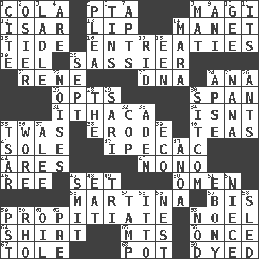 ACROSS 1. Root beer relative 5. Parent Teacher Assoc. 8. Wise men 12. Austrian river, tributary to the Danube 13. Mouth edge 14. French painter Edouard 15. Event that recurs at intervals 16. Pleas 19. Snakelike fish 20. More lively and spirited 21. French philosopher Descartes 23. Heredity factor (abbr.) 24. Santa ___, CA 27. Elects 30. Connect, as a bridge 31. New York city 34. Is not 35. It was, poetically 38. Wear away 40. Afternoon social gatherings 41. Flatfish 42. Medicinal drug used to evoke vomiting 44. Ancient Greek god of war 45. Words to Nanette 46. Portuguese money of account (variant) 47. Put into a specified state 50. Presage 53. Chrissie's court nemesis 57. Again 59. Conciliate 63. Christmas carol 64. Chest covering 65. Mountains (abbr.) 66. At one time in the past 67. Lacquered or enameled metalware 68. Cooking vessel 69. Colored DOWN 1. Quote 2. Flexible twig of a willow tree 3. Dipping utensil 4. "We ___ not amused" (Victoria) 5. Entreaty 6. Airtight sealed metal containers 7. Tenement units (abbr.) 8. Floor covering 9. Cuckoo 10. Unit of force equal to gravity 11. It is 14. Hindu Mythology: god of death 17. To free from 18. Car or cant ending 20. Back-to-school mo. 22. Annoying sounds 24. Domed church section 25. Nanny 26. Pismires 28. Definite Article 29. Indian skirt 30. "Cheers" or "Ellen" 32. Police officer (slang) 33. An important port of Yemen 35. Russian ruler of old 36. Had on 37. Toward shelter 39. Environmental prefix 43. Small Philippine buffalo 47. Stricken, poetically 48. Consume 49. Three (prefix) 51. Black 52. Sibling's daughter 54. Pack (down) 55. "Tell ____ the Marines!" 56. A home for chicks 58. Downhill vehicle 59. Pacific Standard Time (abbr.) 60. 17th letter of the Greek alphabet 61. Lubricate 62. Before (prefix) 63. Lower and raise head in agreement