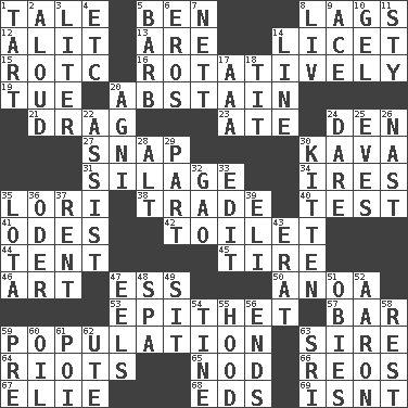 ACROSS 1. Lie 5. Benjamin's nick name 8. Straggles 12. Set down 13. "We ___ not amused" (Victoria) 14. It is permitted: Lat. 15. College mil. group 16. Happening in regular succession 19. Third day of the wk. 20. Choose not to consume 21. To be drawn or hauled along 23. Had dinner 24. Lair 27. Fastener 30. Polynesian shrub of the pepper family 31. Fodder prepared in a silo 34. Angers 35. Australian parrot (variant) 38. Barter 40. Trial 41. Lyric poems 42. Bathroom 44. Portable shelter 45. Become fatigued 46. Tate display 47. Curvy letter 50. Small Philippine buffalo 53. Curse 57. Long, evenly shaped piece 59. Census information 63. Male parent of an animal 64. Debaucheries 65. Lower and raise head in agreement 66. Vintage cars 67. Writer Wiesel 68. Begley and Asner 69. Is not DOWN 1. Small pie 2. Verbally 3. 61 cubic inches 4. And so on (abbr.) 5. Sharp remark 6. Greek god of love 7. Remaining after all deductions 8. 54 in ancient Rome 9. Adept person 10. Set 11. Filthy place 14. Actor's bit 17. American Automobile Association (abbr.) 18. Teat (slang) 20. Hindu god of fire 22. Help 24. Have the gumption 25. Nights before holidays 26. Political cartoonist Thomas 28. The first octave above the treble staff 29. Role in a play 30. Baby cat 32. E Mali city 33. Prepare for publication 35. Globular water bottle used in Asia 36. Baltic tributary 37. Monthly bill 39. Connecticut Ivy Leaguer 43. Part of Q.E.F. 47. Snakelike fish 48. Health resort 49. Be seated 51. Off-Broadway awards 52. Composer Copland 54. Prong on a fork 55. Parka part 56. Conclusions 58. Respite 59. Before (prefix) 60. Lubricate 61. Luau course 62. Shoshoni 63. Indian title of respect (Mr.)