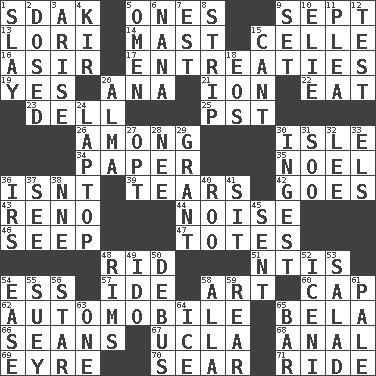 ACROSS 1. Neighbor of Neb. 5. Singles 9. Back-to-school mo. 13. Australian parrot (variant) 14. Vertical spar for supporting sails 15. Cell (Danish) 16. SW Saudi Arabia district 17. Pleas 19. Affirmative reply 20. Santa ___, CA 21. Electrically charged atom 22. Ingest 23. Small valley 25. Pacific Standard Time (abbr.) 26. Amid 30. Capri or Wright 34. Some stationery 35. Christmas carol 36. Is not 39. Rends 42. Moves 43. Former U.S. Attorney General Janet 44. Annoying sound 46. Ooze 47. Hauls 48. To free from 51. Nuclear Threat Initiatives 54. Curvy letter 57. Binary compound 58. Nonscientific branch of learning 60. Head covering 62. Form of transportation 65. Actor Lugosi 66. Actors Connery and Penn 67. Southern CA. univ. 68. Of or related to the anus 69. Jane of fiction 70. Burn superficially 71. Travel on or in a vehicle DOWN 1. Kill 2. Administered medicine 3. Get up 4. Apertif with cassis 5. Sign of something about to happen 6. Grandmother 7. Eastern Standard Time (abbr.) 8. Empty completely 9. Arrange properly for use 10. Writer Wiesel 11. Entreaty 12. Trial 15. Patter 18. Greek goddess of the dawn 20. _ mater 24. Portable computer 27. Choose 28. Born 29. Let have 30. Swallow 31. "Barney Miller" actor Jack 32. Area sheltered from the wind 33. Raised railways 36. Big collection agency 37. Observe 38. Compass dir. 40. Friend of Pooh 41. Be seated 45. Transmitted 48. Basketball hoops 49. Wedding promise 50. To get out of a bus 52. Ancient Celtic tribe of eastern Britain 53. Vegetable dish 54. Relaxation 55. Chop _ 56. Play the lead 58. Silent film actress Nazimova 59. Posterior 61. Diluted with white 63. Single 64. Frozen water 65. Drinking establishment