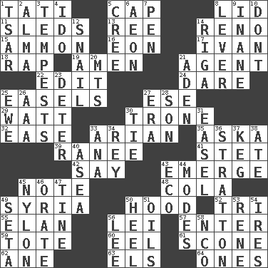 ACROSS 1. Jacques of French films 5. Head covering 8. Flaplike covering 11. Bobsleighs 13. Portuguese money of account (variant) 14. Former U.S. Attorney General Janet 15. ID or VA city 16. Period of immesurable duration 17. "Terrible" tsar 18. Reproach for some lapse or misdeed 19. So be it 21. Representative 22. Prepare for publication 24. Have the gumption 25. Artist's stands 27. Compass dir. 29. Electrical Unit 30. Marketplace scale 32. Comfort 33. Believer in; advocate of (suffix) 35. "____ silly question..." 39. Indian princess (variant) 41. Proofreading order 42. Declare 43. Develop 45. Observe 48. Root beer relative 49. Damascus' land 50. Parka part 52. Three (prefix) 55. Enthusiasm 56. Flowery wreath 57. Keyboard key 59. Carryall 60. Snakelike fish 61. Biscuitlike quick bread 62. A saturated hydrocarbon 63. Raised railways 64. Washington bills DOWN 1. Russian ruler of old 2. _ mater 3. Storms 4. Wedding promise 5. Algonquian 6. Age 7. Writing instrument 8. Prying instrument 9. Silly 10. Do not 12. Slow-paced one 14. Capital of Latvia 20. Mountains (abbr.) 21. An important port of Yemen 23. Prevent from occurring 25. She-sheep 26. American Automobile Association (abbr.) 27. Epoch 28. Boy, to dad 30. Make a knot 31. Artist's stand 33. Santa ___, CA 34. Marina Del _, California 36. Ski resort town in Vermont 37. Cask 38. Had dinner 40. Toward the sea 43. Environmental prefix 44. Methods 45. High-strength synthetic material 46. Declaim 47. Prong on a fork 49. Bristle 50. The bottom of a shoe or boot 51. Lubricates 53. French philosopher Descartes 54. Angers 56. Area sheltered from the wind 58. Non-commissioned officer (abbr.)