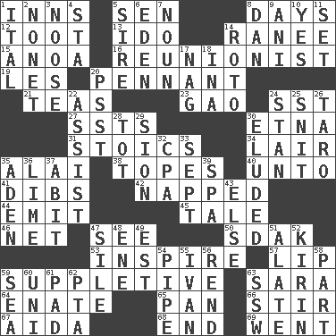 ACROSS 1. Lodging establishments 5. Elected rep. 8. 24-hour periods 12. A blast of a horn 13. Wedding promise 14. Indian princess (variant) 15. Small Philippine buffalo 16. One who advocates reunion 19. French article 20. Pre-World Series prize 21. Beverages made from leaves 23. E Mali city 24. Fast jet (abbr.) 27. Fast planes 30. Inactive volcano in Sicily 31. Unemotional ones 34. Den 35. Jai _ 38. Drinks excessively 40. To (old English) 41. Rights 42. Slept 44. Send forth 45. Story 46. Fish or hair follower 47. Observe 50. Neighbor of Neb. 53. Stimulate to action 57. Mouth edge 59. Supplementary 63. "Two Mules for Sister ____" 64. Maternal 65. Baking dish 66. Disorderly outburst 67. Opera by Verdi 68. Conclusion 69. Left DOWN 1. Slanted text style (abbr.) 2. Music written for nine 3. Trap for birds or small mammals 4. R.R. building 5. Beget 6. Genesis locale 7. Part of speech 8. Daniel's nick name 9. Black tropical American cuckoo 10. Affirmative reply 11. Put into a specified state 14. Printing process, for short 17. Tired old horse 18. _ tizzy (2 wds.) 20. Inconspicuous attention getter 22. Help 24. Comedian Laurel of Laurel & Hardy 25. In a ____ (agitated or irritated) 26. Pacific island yam 28. Small child 29. The Jewish people; Israel 30. Dodged 32. Tax preparer (abbr.) 33. Back-to-school mo. 35. An important port of Yemen 36. Welles in "The Third Man" 37. "This won't hurt ____!" 39. Health resort 43. Otherwise 47. Filth; sediment 48. Compass dir. 49. Eastern Standard Time (abbr.) 51. Having winglike extensions 52. Japanese brewing company 54. Corncob 55. _ the terrible 56. Tear apart 58. Piece 59. Ocean 60. University (slang) 61. Groovy apt. 62. Parent Teacher Assoc. 63. Compass dir.