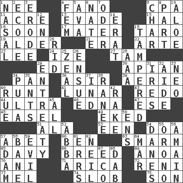 ACROSS 1. Born 4. Papal veil 8. Tax preparer (abbr.) 11. Measure of real estate 13. Elude 15. Actor Linden 16. Within a short period 17. Mother 18. Pacific island yam 19. Tree or shrub in the Birch family 21. Period 22. Johnson of "Laugh-In" 23. Area sheltered from the wind 24. Ending with capital 27. Scottish cap 29. Paradise 30. Bee-related 34. Baking dish 36. SW Saudi Arabia district 39. Nest on high 40. Undersized animal 41. Type of eclipse 43. Do over again 44. Extremist 46. Pulitzer Prize-winning author Ferber 47. Compass dir. 48. Artist's stand 49. Supplemented with great effort 51. Insect wing 53. Car or cant ending 54. ___ good deed 57. Collude with 60. Benjamin's nick name 63. Excessive but superficial compliments 65. American folk hero Crockett 66. A special lineage 69. Small Philippine buffalo 70. Black tropical American cuckoo 71. N. Chile seaport 72. Painter Guido (1575-1642) 73. Cartoonist voice _ Blanc 74. Oscar Madison type 75. Boy, to dad DOWN 1. Relating to the nose 2. Learning spot: Fr. 3. Eat (away) 4. Opposite of masc. 5. Actress Gardner 6. Nathan's nickname 7. Baltic tributary 8. Burn to charcoal 9. Role in a play 10. _ vera 12. Compass dir. 14. Part of Q.E.F. 18. ________ with (broke a safety seal) 20. To free from 25. Ardor 26. Take place subsequently 28. American Automobile Association (abbr.) 29. Plea 31. Angers 32. Assistant 33. Modern: prefix 34. Monetary unit of Botswana 35. Pismires 37. Working for oneself (abbr.) 38. Indian princess (variant) 40. Sorrow 42. Immoral or dissolute person 45. 100% 50. Followers of ems 52. Swedish rock group 54. Natives or inhabitants of Denmark 55. U. of Maine site 56. At full speed 57. First man 58. Object of repulsion 59. Morally bad or wrong 61. Blunders 62. Famous astronaut Armstrong 64. Third mo. 67. Environmental prefix 68. Small moist lump or mass