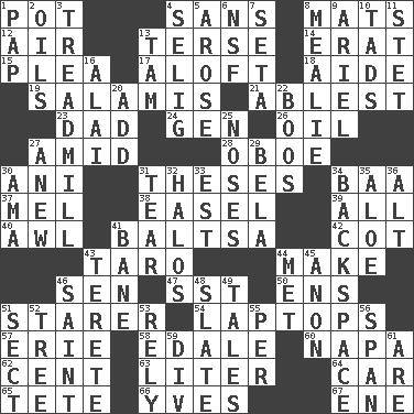 ACROSS 1. Cooking vessel 4. Without 8. Floor protectors 12. Atmosphere 13. Laconic 14. Part of Q.E.F. 15. Entreaty 17. Upward 18. Assistant 19. Deli grouping 21. Most capable 23. Male parent 24. Commissioned mil. rank 26. Petroleum 27. Among 28. Mitch Miller's instrument 30. Cuckoo 31. College papers 34. Sound made by sheep 37. Cartoonist voice _ Blanc 38. Artist's stand 39. Everything 40. Leather borer 41. Greek mezzo-soprano Agnes 42. Small bed 43. Edible starchy tuberous root 44. Create 46. Elected rep. 47. Fast jet (abbr.) 50. Followers of ems 51. A viewer who gazes fixedly 54. Portable computers 57. 4th largest of the Great Lakes 58. Peak District village in England 60. California wine valley 62. Penny 63. 61 cubic inches 64. 4-wheeled motor vehicle 65. False hair 66. Jacques Cousteau's middle name 67. Compass dir. DOWN 1. Infant food 2. Petroleums 3. Excercise machine 4. Former Milwaukee Brewers owner Bud 5. Came up 6. Overdraft (abbr.) 7. Bristle 8. Ear of corn 9. Satellite of Uranus 10. Bits 11. Proofreading order 13. Scottish cap 16. Mountain range southwest of Kyrgyzstan 20. Say or write further 22. Scornful sounds 25. Olfactory organs 27. Afresh 29. Actor Lugosi 30. Nanny (var.) 31. Lacerate 32. Saint headwear 33. Eastern Standard Time (abbr.) 34. Keyboard key 35. Medicinal plant 36. Keyboard modifier key 41. Object of repulsion 43. Cylindrical with tapered ends 44. Was introduced to 45. Soon (poet.) 46. Virtuous person 48. Chalkboard 49. Stories 51. Religious group 52. Relationship diagram 53. Trust 55. For each 56. Connect, as a bridge 59. HTML Container Element 61. "We ___ not amused" (Victoria)