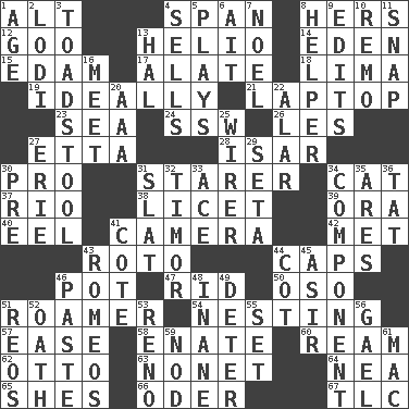 ACROSS 1. Keyboard modifier key 4. Connect, as a bridge 8. Possessive pronoun 12. Thick or sticky substance 13. Sun: prefix 14. Genesis locale 15. Dutch treat 17. Having winglike extensions 18. Pale green bean 19. Under perfect conditions 21. Portable computer 23. Ocean 24. Compass dir. 26. French article 27. Singer James 28. Austrian river, tributary to the Danube 30. Adept person 31. A viewer who gazes fixedly 34. Domesticated feline 37. River (Sp.) 38. It is permitted: Lat. 39. Mouth or opening 40. Snakelike fish 41. Device for capturing images 42. Was introduced to 43. Printing process, for short 44. Balmoral and tarboosh 46. Cooking vessel 47. To free from 50. Bear (Spanish) 51. Nomad 54. Inhabiting a nest 57. Relaxation 58. Related on the mother's side 60. 480, 500 or 516 sheets of paper 62. Von Bismarck 63. Music written for nine 64. Teachers' org. 65. "______ My Girl" (Turtles hit) 66. Baltic tributary 67. Affectionate concern, for short DOWN 1. Personal question 2. Farming town in central California 3. Inedible or poisonous agaric 4. Makes a sale 5. Frolics 6. Small island 7. Christmas carol 8. Aide 9. Proofreads 10. San ____ (Riviera town) 11. Fastener 13. Actor Linden 16. Rendezvous 20. American Automobile Association (abbr.) 22. Having or resembling wings 25. One who wires 27. One of the Great Lakes 29. Stalk of a moss capsule 30. Before (prefix) 31. Narrow board 32. The easternmost of the Lesser Sundas 33. Adept person 34. Piece 35. Ancient Greek god of war 36. Make lace 41. ____ d'Azur (French Riviera) 43. Lover boys 44. Small bed 45. SW Saudi Arabia district 46. Thick mixture 48. Empty; void 49. Prevent from occurring 51. Vintage cars 52. Pledge 53. Former U.S. Attorney General Janet 55. Put into a specified state 56. Highlander 59. Lower and raise head in agreement 61. Big _