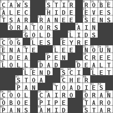 ACROSS 1. Crow sounds 5. Move through with a circular motion 9. Loose flowing garment 13. Actor Baldwin 14. Flintstone garb 15. Nights before holidays 16. Russian ruler of old 17. Indian princess (variant) 18. Elected reps. 19. Speakers 21. The 18th letter of the Arabic alphabet 22. Gilt 23. Flaplike coverings 24. Gear tooth 27. French article 28. Jane of fiction 29. Maternal 31. Area sheltered from the wind 32. Part of speech 36. The content of cognition 37. Fenced enclosure 38. Algonquian 39. Hang loosely or laxly 40. June honoree 41. Started a card game 42. Grant temporary use of 44. _-fi 46. Allow 47. Portico 48. "Mermaids" star 50. Baking dish 51. Sycophants 54. Calm and collected 56. Capital of Egypt 58. NW Algerian seaport 60. Mitch Miller's instrument 61. Corncob 62. Edible starchy tuberous root 63. Zero-star reviews 64. Among 65. Play the lead DOWN 1. Domesticated feline 2. In addition 3. Put on (as clothing) 4. Strangle with an iron collar 5. Broken pieces 6. Airtight sealed metal containers 7. Binary compound 8. To separate or throw off 9. Dwelling 10. Baking chambers 11. Benjamin's nick name 12. Curvy letter 17. Hero or heavy, e.g. 20. Lacquered or enameled metalware 21. Atmosphere 23. Potassium hydroxide 24. To provide with a ceiling 25. Southwest Nigerian state 26. Highlander 28. Car or cant ending 30. Baron Munchausen's specialties 31. Directed 33. Spoken 34. Ubangi River tributary 35. Remaining after all deductions 37. Writing tablet 40. Heredity factor (abbr.) 41. Passed on 43. Age 44. Tallied 45. US Secretary of Labor Elaine L. _ 47. Soup utensil 49. Disturbances 51. Native american tent (variation) 52. Part of Q.E.F. 53. "Two Mules for Sister ____" 54. Police officer (slang) 55. Chief or king in Benin or Nigeria 56. Tax preparer (abbr.) 57. Direct toward a target or goal 59. And not