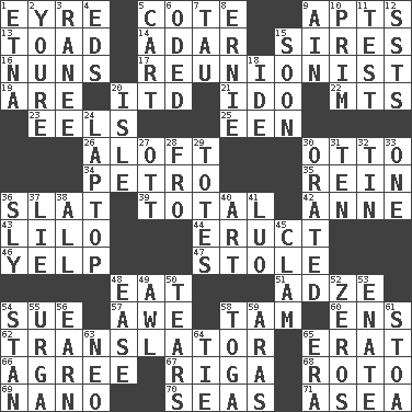 ACROSS 1. Jane of fiction 5. ____ d'Azur (French Riviera) 9. Tenement units (abbr.) 13. Frog relative 14. The sixth month of the Jewish calendar 15. Titles for men of rank and authority 16. Religious women 17. One who advocates reunion 19. "We ___ not amused" (Victoria) 20. It would 21. Wedding promise 22. Mountains (abbr.) 23. Snakelike fish 25. Car or cant ending 26. High up in or into the air 30. "Beetle Bailey" pooch 34. Stone: prefix 35. It's straight from the horse's mouth 36. Narrow board 39. "_____ Recall" 42. Singer Murray 43. _ and Stitch 44. Spew [out] 46. Sharp bark 47. Fur scarf 48. Ingest 51. Axlike tool, used for shaping wood 54. Take to court 57. Deep reverence 58. Scottish cap 60. Followers of ems 62. Interpreter 65. Part of Q.E.F. 66. Match 67. Capital of Latvia 68. Printing process, for short 69. Billionth: prefix 70. Oceans 71. At sea DOWN 1. Inactive volcano in Sicily 2. You are 3. Indian princess (variant) 4. Begley and Asner 5. Heavy open wagon 6. Wrote a lyric poem 7. The 19th letter of the Greek alphabet 8. Bert's buddy 9. The 18th letter of the Arabic alphabet 10. Demure 11. Trial 12. Fast planes 15. Within a short period 18. Binary compound 20. Capri or Wright 24. Portable computer 27. Baseball player Mel 28. Away 29. Lugs 30. Declaimed 31. Nine, plus one 32. Shallow baking pan 33. Single 36. Playfully artful 37. Untruth 38. Everything 40. Tate display 41. Nilotic language 45. Dollar (slang) 48. Relaxation 49. Leather borer 50. Rends 52. Nothings 53. Related on the mother's side 54. Comedian Laurel of Laurel & Hardy 55. Capital and largest city of Mongolia 56. Merit 58. Ancient Roman robe 59. Caspian sea tributary 61. Portico 63. Modern: prefix 64. Make a knot 65. Period