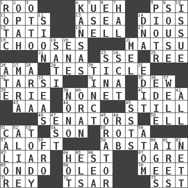ACROSS 1. Friend of Pooh 4. Malaysian steamed pastry 8. Air pressure measure (abbr.) 11. Chooses 13. Toward the sea 14. "Vaya con ____" 15. Jacques of French films 16. 1994 drama film starring Jodie Foster 17. Good sense 18. Opts 21. Taiwanese island in East China Sea 22. Grandmother 23. Compass dir. 25. To riddle 26. Housemaid (var.) 29. One of the two male reproductive glands 32. Tarsus (plural) 34. _ tizzy (2 wds.) 35. Morning condensation 38. 4th largest of the Great Lakes 39. Music written for nine 41. The content of cognition 43. Auto club (abbr.) 44. The grampus (Milton) 45. Free from disturbance or agitation 46. Elected representatives 50. Pipe bend 51. Domesticated feline 54. Boy, to dad 55. Round or rotation of duties 57. High up in or into the air 59. Choose not to consume 63. One who doesn't tell the truth 64. Command 67. Legendary monster 68. Southwest Nigerian state 69. Butter sub 70. Rendezvous 71. Marina Del _, California 72. Russian ruler of old 73. Fast jet (abbr.) DOWN 1. College mil. group 2. Brightly colored fish 3. "Beetle Bailey" pooch 4. Sunflower state 5. Purpose 6. Snakelike fish 7. Actor Linden 8. Peter (Polish) 9. Lush 10. Come out of 12. The Jewish people; Israel 14. Heredity factor (abbr.) 19. Suttee (variant) 20. Compass dir. 21. Cartoonist voice _ Blanc 23. Trig term 24. Get outta here! 26. Had dinner 27. Hindu Mythology: god of death 28. Roberta Peters solo 30. Colored lightly or faintly 31. Prepare for publication 33. Oceans 36. Singer Brickell 37. Not ill 39. Words to Nanette 40. Northwest Algerian city 42. 100% 45. Fast planes 47. Eastern Standard Time (abbr.) 48. Speaker 49. Director Reiner 51. Bodily heat indicating an inflammation 52. Place in a line 53. Sycophant 56. Smallest unit of an element 58. From 60. Eras 61. Angers 62. Remaining after all deductions 64. Being at a high temperature 65. Raised railways 66. Ocean