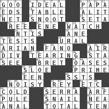 ACROSS 1. Thick or sticky substance 4. Perfect 9. Dad 13. Begley and Asner 14. Eating place 15. Set down 16. Fish or hair follower 17. Snout, nose 18. Bristle 19. To sift 21. Compass dir. 22. Timepiece 24. Nuclear Threat Initiatives 26. A saturated hydrocarbon 27. Trials 29. Mountain range 30. Believer in; advocate of (suffix) 31. Papal veil 33. Wind 36. HTML Container Element 37. Rending 40. R.R. building 41. Observe 42. Cy Young winner Saberhagen 43. Fertile tracts in a desert 45. A type of plum 47. First class 48. Car or cant ending 49. Fast planes 50. Annoyingly loud 52. Marina Del _, California 54. And so on (abbr.) 56. Chilled 57. Father Junipero _ 59. Sandy's bark 61. Whimper 62. Slow-paced one 63. Teachers' org. 64. Of or related to the anus 65. "_____ Recall" 66. "___ Little Indians" DOWN 1. Commissioned military rank (abbr.) 2. River in Europe 3. Clearly or manifestly demonstrative 4. ___ a Wonderful Life 5. Natives or inhabitants of Denmark 6. Inky black, to poets 7. Medicinal plant 8. Allow 9. Soft color 10. Actor Baldwin 11. Essential or central part 12. "One Day ___ Time" 20. Singer James 22. Make _____ (do battle with) 23. Santa ___, CA 25. Is not 27. Small amounts or degrees 28. 4th largest of the Great Lakes 29. A single undivided whole 31. Conductor's collection 32. "We ___ not amused" (Victoria) 33. Aide 34. Detail 35. Raze (variant) 38. Dark wood 39. Republicans 44. Johnson of "Laugh-In" 45. Beer mug 46. French article 49. Damascus' land 50. Part of speech 51. Rounded earthenware pot or jar 52. Western Nevada city 53. Part of Q.E.F. 55. Algonquian 56. Tax preparer (abbr.) 57. Fast jet (abbr.) 58. 100% 60. Avid follower