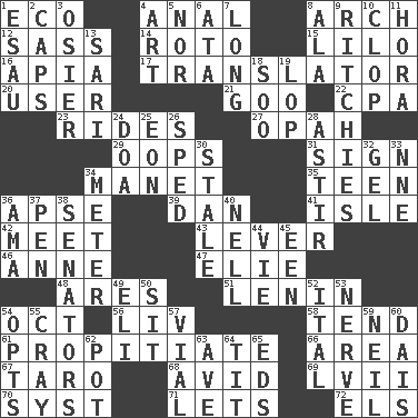 ACROSS 1. Environmental prefix 4. Of or related to the anus 8. Bowlike part 12. Backtalk 14. Printing process, for short 15. _ and Stitch 16. Capital of Western Samoa 17. Interpreter 20. One who makes use of a thing 21. Thick or sticky substance 22. Numbers guy (abbr.) 23. Amusement-park features 27. Brightly colored fish 29. I made a mistake 31. Attach a signature 34. French painter Edouard 35. Adolescent 36. Domed church section 39. Daniel's nick name 41. Small island 42. Confront 43. Prying instrument 46. Singer Murray 47. Writer Wiesel 48. Ancient Greek god of war 51. Soviet premier 1918-24 54. Sep. follower 56. 54 in ancient Rome 58. Be inclined (to) 61. Conciliate 66. Type of rug 67. Pacific island yam 68. Enthusiastic 69. 57 in ancient Rome 70. System (abbr.) 71. Allows 72. Raised railways DOWN 1. He sold his birthright 2. Smile enhancers 3. Flexible twig of a willow tree 4. Nonscientific branch of learning 5. And not 6. "One Day ___ Time" 7. Having great length 8. According to 9. Actors Guy, Robert Welles, and Clint 10. Hoof sound 11. Israeli folk dance 13. Indian skirt 18. "Barney Miller" actor Jack 19. Chop off 24. ___ good deed 25. A really long time 26. Broke a traffic law 28. Moving about 30. Having lost freshness 32. Set 33. Compass dir. 34. Distance measurement 36. Wet nurse (var.) 37. Animal enclosure 38. Elected representatives 40. 1994 drama film starring Jodie Foster 44. Compete 45. Car or cant ending 49. Biblical high priest 50. Be seated 52. Slanted text style (abbr.) 53. Effrontery 54. Chooses 55. Supercomputer manufacturer 57. Small bottle 59. Famous astronaut Armstrong 60. Raised platform 62. Plant holder 63. "___ Maria" 64. Teat (slang) 65. Begley and Asner
