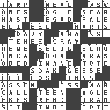 ACROSS 1. Canvas cover 5. Be tempered by heat 9. Compass dir. 12. Washington bills 13. Stare at amorously 14. Burn superficially 15. Vertical spar for supporting sails 16. Mild oath 17. Diluted with white 18. Connecticut Ivy Leaguer 19. Snakelike fish 21. Shops 22. American folk hero Crockett 24. Santa ___, CA 26. Fast jet (abbr.) 27. Giggle 28. Supercomputer manufacturer 29. French philosopher Descartes 30. Former Milwaukee Brewers owner Bud 32. Shade of tan 36. South American Indian 37. ___ good deed 38. Caspian sea tributary 39. Wrote a lyric poem 40. Silly 42. Haul 43. Neighbor of Neb. 44. Honkers 46. Luau accessory 49. Greek goddess of the dawn 50. Taverns 51. NE Netherlands city 53. Curvy letter 54. Armed conflict 57. Give a ring to 58. Adolescent 61. Short-tailed, large-bodied rat 62. Makes supply last 63. Tear apart 64. SW Asia republic 65. Be seated 66. _ china 67. Prepare for publication DOWN 1. Heavy book 2. Of or related to the anus 3. Dwelling 4. Pacific Standard Time (abbr.) 5. Christmas carol 6. Oval reproductive body of a fowl 7. Chicken ___ king 8. Directed 9. Erodes 10. Table seasonings 11. Obtain by seizing forcibly or violently 14. Health resort 19. First lady 20. Sight organs 21. Fifth month 23. Having the leading position 24. Believer in; advocate of (suffix) 25. Tired old horse 27. Look after 28. Cover or conceal 29. _ de Janeiro 31. Ferber et al. 32. Consumed 33. What you're doing now 34. Pace 35. Purpose 40. Wedding promise 41. Armor plate that protects the chest 43. Elected rep. 45. Followers of ems 46. Shoestrings 47. 1973 Nobel Price Winner (Physics) Leo 48. Small island 52. Raised railways 53. Inside; within (prefix) 55. Mountain range southwest of Kyrgyzstan 56. Monthly bill 58. Three (prefix) 59. Car or cant ending 60. Conclusion 61. Compete