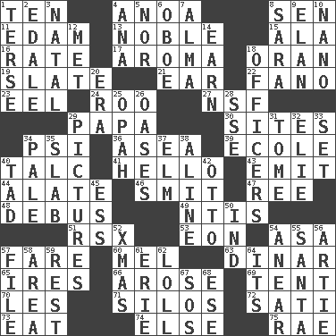 ACROSS 1. Nine, plus one 4. Small Philippine buffalo 8. Elected rep. 11. Dutch treat 13. Impressive in appearance 15. Wing 16. Assign a rank or rating to 17. Scent 18. Northwest Algerian city 19. Chalkboard 21. Ewer handle 22. Papal veil 23. Snakelike fish 24. Friend of Pooh 27. Science/research agcy. 29. Dad 30. Settings 34. Air pressure measure (abbr.) 36. Toward the sea 39. Learning spot: Fr. 40. Baby powder 41. Phone greeting 43. Send forth 44. Having winglike extensions 46. Stricken, poetically 47. Portuguese money of account (variant) 48. To get out of a bus 49. Nuclear Threat Initiatives 51. Acura sports coupe 53. Period of immesurable duration 54. White ___ sheet 57. Conductor's collection 60. Cartoonist voice _ Blanc 63. Middle Eastern gold or silver currency 65. Angers 66. Came up 69. Portable shelter 70. French article 71. Grain storage towers 72. Suttee (variant) 73. Erode 74. Otherwise 75. Actress Charlotte DOWN 1. Laconic 2. Peak District village in England 3. Brizilian seaport 4. Santa ___, CA 5. Not either 6. Mitch Miller's instrument 7. _ mater 8. "Two Mules for Sister ____" 9. Enthusiasm 10. Billionth: prefix 12. Was introduced to 14. Merit 18. Persons of authority 20. Period 25. Brightly colored fish 26. Fertile tracts in a desert 28. Compass dir. 29. Photos 31. Heavy book 32. Writer Wiesel 33. Put into a specified state 34. Light colored 35. Thick slice 37. Shade tree 38. Place in a line 40. Bit 42. Von Bismarck 45. Curvy letter 50. Indiana (abbr.) 52. Dec. holiday 54. Approach 55. Before Barbara or Clara 56. Nick name for Arthur 57. Do some clerical work 58. Length times width 59. State of inaction 61. 4th largest of the Great Lakes 62. Hang loosely or laxly 64. It is 67. Distress signal 68. Compass dir.