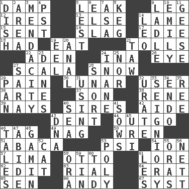ACROSS 1. Moist 5. Path through which fluid escapes 9. Part of a journey 12. Angers 13. Otherwise 14. Unable to walk 15. Transmitted 16. Volcanic refuse 17. Singer Brickell 18. Possessed 19. Ingest 21. For Whom the Bell _____ 22. Arabian gulf 24. _ tizzy (2 wds.) 26. Sight organ 27. Any of the three canals of the cochlea 28. Frozen precipitation 29. Ache 30. Type of eclipse 32. One who makes use of a thing 36. Johnson of "Laugh-In" 37. Boy, to dad 38. French philosopher Descartes 39. Negative votes 40. Titles for men of rank and authority 42. Helper 43. Scratch 44. Outlay 46. Label 49. Tired old horse 50. Songbird 51. Phillipine bananalike plant 53. 23rd letter of the Greek alphabet 54. Electrically charged atom 57. Pale green bean 58. "Beetle Bailey" pooch 61. Old wives' tales, e.g. 62. Prepare for publication 63. Monetary unit of Yemen 64. Part of Q.E.F. 65. Elected rep. 66. "60 Minutes" Commentator Rooney 67. System (abbr.) DOWN 1. Food container 2. Type of rug 3. Ananias' fault 4. Pacific Standard Time (abbr.) 5. For fear that 6. Pipe bend 7. White ___ sheet 8. Cask 9. Dipping utensil 10. Poet Dickinson 11. Honkers 14. Lion 19. Snakelike fish 20. Of or related to the anus 21. The 23rd letter of the Hebrew alphabet 23. Natives or inhabitants of Denmark 24. Silly 25. Or not 27. "Two Mules for Sister ____" 28. Derisive sound 29. Baking dish 31. Exploiting 32. A salt of uric acid 33. Signiory (variant) 34. Inside; within (prefix) 35. Portuguese money of account (variant) 40. Ocean 41. Sty mamas 43. Heredity factor (abbr.) 45. RI univ. 46. Falsehoods 47. Stay 48. Street urchin 52. Feline 53. Much (prefix) 55. Mouths or openings 56. Remaining after all deductions 58. Mouth or opening 59. Metal container 60. Small amount or degree 61. French article