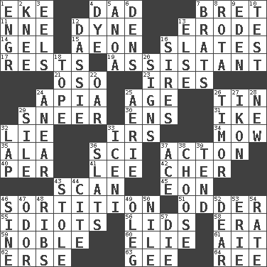 ACROSS 1. Make supply last 4. June honoree 7. Cy Young winner Saberhagen 11. Compass dir. 12. Unit of force 13. Eat (away) 14. Set 15. Period of immesurable duration 16. Chalkboards 17. Musical pauses 19. Aide 21. Bear (Spanish) 23. Angers 24. Capital of Western Samoa 25. Personal question 26. Metal container 29. Scornful expression 30. Followers of ems 31. Mamie's husband 32. Falsehood 33. Big collection agency 34. Cut the grass 35. According to 36. _-fi 37. 13-14th century defensive garment 40. For each 41. Area sheltered from the wind 42. "Mermaids" star 43. Examine hastily 45. A really long time 46. Determination 51. More peculiar 55. Foolish or stupid persons 56. Flaplike coverings 58. Period 59. Having high moral qualities 60. Writer Wiesel 61. Small island 62. Celtic language 63. Turn to the right 64. Portuguese money of account (variant) DOWN 1. Engineer (abbr.) 2. Leg joint 3. Snakelike fish 4. Color 5. Small Philippine buffalo 6. Hiding places for outlaws 7. Naughty children 8. Roll call or roster of names 9. Locale of original sin 10. Trial 12. Small ungulate mammals of Africa 13. Otherwise 16. Fathers 18. Drink excessively 20. Attaches a signature 22. Boat paddle 24. Approach 25. Nest on high 26. The easternmost of the Lesser Sundas 27. Picture 28. ___ Haven, CT 29. Drop; flow; fall 32. Pet locale 33. Ancient Celtic tribe of eastern Britain 36. Narrow boards 37. Adept person 38. Opt 39. Be inclined (to) 43. Took without asking 44. Quote 46. Trig term 47. Scent 48. Teases 49. Cassini of fashion 50. The longest river in the world 52. Letter starter 53. One of the Great Lakes 54. Assign a rank or rating to 57. Expire