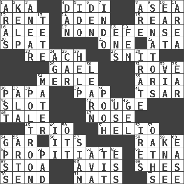 ACROSS 1. Alias (abbr.) 4. "You Light Up My Life" star Conn 8. Toward the sea 12. Monthly bill 14. An important port of Yemen 15. Tail end 16. Toward shelter 17. Unrelated to defense, as in spending 20. Petty quarrel 21. Single 22. "One Day ___ Time" 23. Arrive at 27. Stricken, poetically 29. Highlander 31. Be footloose 34. Haggard of country music 35. Operatic vocal solo 36. Dad 39. Infant food 41. Russian ruler of old 42. Position in a hierarchy or organization 43. Makeup applied to the cheeks 46. Story 47. Characteristic smell of wine 48. Musical group of three 51. Sun: prefix 54. Slender fish 56. ___ a Wonderful Life 58. Libertine 61. Conciliate 66. Inactive volcano in Sicily 67. Portico 68. Deliberation 69. "______ My Girl" (Turtles hit) 70. Post 71. Floor protectors 72. Perceive with the eye DOWN 1. Ancient river in northeast Turkey 2. Seaweed 3. Approach 4. One of the 12 tribes of Israel 5. Wedding promise 6. Lair 7. Southeast Asian peninsula 8. "We ___ not amused" (Victoria) 9. Elected representatives 10. Compass direction 11. Type of rug 13. False hair 18. Followers of ems 19. Opposite of masc. 24. Mature 25. Auto 26. Assist 28. Feeling or showing extreme anger 30. Memorize 32. By way of 33. Ewer handle 34. Mother 36. Pacific Standard Time (abbr.) 37. In the manner of 38. Coward 40. "Silly old bear" 44. Purpose 45. Set 49. One more than two 50. Baseball player Mel 52. Angers 53. Curses 54. Global Positioning Systems (abbr.) 55. Johnson of "Laugh-In" 57. Thailand, formerly 59. Leg joint 60. Relaxation 62. Groovy apt. 63. Actress Gardner 64. Teat (slang) 65. Curvy letter