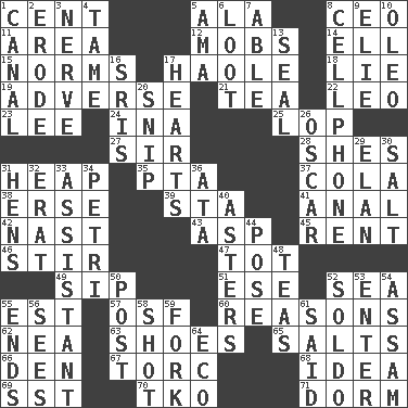 ACROSS 1. Penny 5. In the manner of 8. Corporate head (abbr.) 11. Type of rug 12. Crowds into 14. Pipe bend 15. Typical models 17. White Person, in Hawaii 18. Falsehood 19. Contrary to your interests or welfare 21. Beverage made from leaves 22. Lion 23. Area sheltered from the wind 24. _ tizzy (2 wds.) 25. Trim (branches) 27. Title for a knight 28. "______ My Girl" (Turtles hit) 31. Pile 35. Parent Teacher Association (abbr.) 37. Root beer relative 38. Celtic language 39. R.R. building 41. Of or related to the anus 42. Political cartoonist Thomas 43. Viper 45. Monthly bill 46. Tumult 47. Small child 49. Small drink 51. Compass dir. 52. Ocean 55. Eastern Standard Time (abbr.) 57. Order of Saint Francis (abbr.) 60. Thinks logically 62. Teachers' org. 63. Imelda's hoard 65. Table seasonings 66. Lair 67. Torque (variant) 68. It may be bright or harebrained 69. Fast jet (abbr.) 70. Ring climax 71. Dormintory (informal) DOWN 1. Lessep's creation 2. Wear away 3. Boldness 4. Not wild 5. Nursemaid (var.) 6. Plunder 7. Competent 8. Portable communications device 9. Writer Wiesel 10. Margarine 13. Lick closed 16. Indian titles of respect 17. Centers of feelings and intuitions 20. Sever or remove by pinching or nipping 26. Witty Wilde 29. Style 30. Table seasoning 31. Coop moms 32. Part of Q.E.F. 33. Aide 34. _ dish (used to culture cells) 36. _ moment's notice (2 wds.) 40. Michaelmas daisies 44. Introduce or present, as a question 48. Beverages made from leaves 50. Mail 52. Twentieth part of a lira 53. Keyboard key 54. Indian state 55. Extremities 56. Observes 58. Guess 59. Tined utensil 61. Stated 64. Environmental prefix
