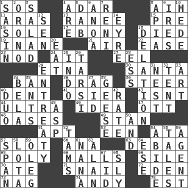 ACROSS 1. Distress signal 4. The sixth month of the Jewish calendar 8. Direct toward a target or goal 11. Caspian sea tributary 13. Indian princess (variant) 15. Before (prefix) 16. Flatfish 17. Black 18. Passed on 19. Lacking in sense or substance 21. Atmosphere 22. Relaxation 23. Dreamland 24. Small island 27. Snakelike fish 29. Inactive volcano in Sicily 30. Before Barbara or Clara 34. Prohibit 36. To be drawn or hauled along 39. Navigate 40. Incision 41. Flexible twig of a willow tree 43. Is not 44. Extremist 46. The content of cognition 47. Baseball player Mel 48. Fertile tracts in a desert 49. Comedian Laurel of Laurel & Hardy 51. Fitting 53. Car or cant ending 54. _ moment's notice (2 wds.) 57. Slit 60. Santa ___, CA 63. Debunk (Brit. slang) 65. Many (prefix) 66. Promenades 69. Filth; sediment 70. Had dinner 71. Slow-paced one 72. Genesis locale 73. Tired old horse 74. "60 Minutes" Commentator Rooney 75. Eastern Standard Time (abbr.) DOWN 1. Indian antelope 2. U. of Maine site 3. First course 4. "We ___ not amused" (Victoria) 5. Apply (a substance) by light strokes 6. Small Philippine buffalo 7. Painter Guido (1575-1642) 8. Capital of Western Samoa 9. Angers 10. Ancient Persian 12. Elected rep. 14. Jane of fiction 18. Conveyance 20. Erode 25. _ china 26. Tarsus (plural) 28. Curvy letter 29. Plea 31. A home for chicks 32. Portable shelter 33. Nonscientific branch of learning 34. Actor Lugosi 35. Pismires 37. Assist 38. Honkers 40. Superhero pair 42. Pace 45. Cleo's killer 50. Added to 52. Scottish caps 54. Tolerate 55. Lies 56. Rep 57. Connect, as a bridge 58. Globular water bottle used in Asia 59. Cassini of fashion 61. Nanny 62. ____ Jay Lerner 64. Compass dir. 67. Flaplike covering 68. Insidious