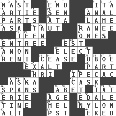 ACROSS 1. Political cartoonist Thomas 5. Conclude 8. Call ___ day 11. Nick name for Arthur 13. Elected rep. 14. Of or related to the anus 15. Actors' quests 16. _ moment's notice (2 wds.) 17. Unable to walk 18. White ___ sheet 19. Pulled tight 21. The wife of a rajah (variant) 22. Adolescent 24. Singles 25. Main course 27. Eastern Standard Time (abbr.) 29. Soon (poet.) 30. Choose 32. Painter Guido (1575-1642) 33. Desist 35. Mitch Miller's instrument 39. Honor 41. Role in a play 42. Medical imaging device (abbr.) 43. Medicinal drug used to evoke vomiting 45. "____ silly question..." 48. Keg 49. Connects, as a bridge 50. Collude with 52. Make lace 55. One of the Great Lakes 56. Ripen 57. Peak District village in England 59. Prong on a fork 60. Cartoonist voice _ Blanc 61. Thermoplastic polyamide 62. Keyboard modifier key 63. Pacific Standard Time (abbr.) 64. Made supply last DOWN 1. California wine valley 2. Caspian sea tributary 3. Ski resort town in Vermont 4. Teat (slang) 5. Son of Isaac 6. Remaining after all deductions 7. Heredity factor (abbr.) 8. Lacking in sense or substance 9. Makes less strong or intense 10. Toward shelter 12. First name in cosmetics 14. ____ Jay Lerner 20. A saturated hydrocarbon 21. College mil. group 23. Bert's buddy 25. Hearing organ 26. Compass dir. 27. Raised railways 28. Perceive with the eye 30. Consume 31. Drinks excessively 33. Automobile 34. Biblical high priest 36. Sass 37. Mouth or opening 38. And so on (abbr.) 40. Dec. holiday 43. Frozen water 44. Eucharist need 45. Showery time 46. Inhabitant of Heaven 47. Leg joint 49. Bristle 50. Ripens 51. Waist strap 53. Medicinal plant 54. Watch over 56. Electrical Unit 58. Color