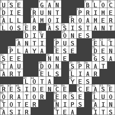 ACROSS 1. Purpose 4. Separate the seeds from cotton 7. Group of countries in special alliance 11. Pass on 12. The smallest animal of a litter 13. First class 14. Everything 15. Mine, in Marseilles 16. Wanderer 17. Failure 19. Helper 21. HTML Container Element 23. Singles 24. Opposed to 25. Purulenc 26. Connecticut Ivy Leaguer 29. Beach, in Buenos Aires 30. Compass dir. 31. Lair 32. Perceive with the eye 33. Compass dir. 34. Girls' org. (abbr.) 35. The 19th letter of the Greek alphabet 36. Spanish title 37. Small fatty European fish 40. Tate display 41. Raised railways 42. One who doesn't tell the truth 43. Globular water bottle used in Asia 45. It is so 46. Home 51. Stop 55. Speaker 56. Celtic language 58. Nilotic language 59. Carrier 60. Pinches, bites 61. The 18th letter of the Arabic alphabet 62. SW Saudi Arabia district 63. Beverage made from leaves 64. ___ a Wonderful Life DOWN 1. Freehold land 2. Grain storage tower 3. Snakelike fish 4. Chewing product 5. Small Philippine buffalo 6. Nuclear Threat Initiatives 7. Naughty children 8. Pale green bean 9. Sign of something about to happen 10. Sure thing 12. Noteworthy scarcity 13. Airs 16. Remove soap 18. Pulitzer Prize-winning author Ferber 20. Lush 22. By way of 24. Native American of Southwest Alaska 25. Actor Sean's family 26. _ Allan Poe 27. For fear that 28. _ tizzy (2 wds.) 29. Lightbulb-shaped fruit 32. R.R. building 33. Pitcher Ryan 36. Prevent from occurring 37. Mischievous 38. Parts 39. To erase 43. 61 cubic inches 44. Scent 46. Round or rotation of duties 47. Greek god of love 48. Suttee (variant) 49. Penny 50. One of the Great Lakes 52. Mountain range southwest of Kyrgyzstan 53. Set of matching outer garments 54. Immeasurably long periods of time 57. Health resort