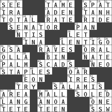 ACROSS 1. Observe 4. Docile 8. Petty quarrel 12. Lyricist Gershwin 13. An important port of Yemen 14. Hyperbolic tangent 15. "_____ Recall" 18. Assign a rank or rating to 19. Travel on or in a vehicle 20. Legislator 22. Baking dish 23. Nuclear Threat Initiatives 24. Allow 25. _ tizzy (2 wds.) 26. Small, flat, pigmented spot on the skin 30. Girls' org. (abbr.) 33. All-night dance parties 36. Of the mouth 37. Rounded earthenware pot or jar 39. Storage container 40. Nathan's nickname 41. Inside of hand 42. Heaps 44. Modern: prefix 45. Paper fasteners 47. Boat paddle 50. Age 51. Angers 53. Attempt to accomplish something 54. Deli grouping 57. Type of rug 59. Promenade 61. Having a sole or soles 63. Austrian-born American filmmaker Fritz 64. Small Philippine buffalo 65. Single 66. False hair 67. Adolescent 68. Compass dir. DOWN 1. Be seated 2. Greek god of love 3. Consumed 4. Pacific island yam 5. The sixth month of the Jewish calendar 6. Was introduced to 7. Compass dir. 8. Ski resort town in Vermont 9. Ache 10. Added to 11. Definite Article 16. Opposed to 17. (Had) reclined 21. Russian ruler of old 22. Animal enclosure 24. French article 26. Grant temporary use of 27. SW Asia republic 28. Yard entry 29. Margarine 30. Republicans 31. Narrow board 32. Silent film actress Nazimova 34. Lettered men learn these first 35. By way of 38. Electrical Measurement 42. Elected rep. 43. Land 46. Myrna of the movies 48. Ancient river in northeast Turkey 49. San ____ (Riviera town) 52. Grain storage towers 53. Portable shelter 54. _ gin 55. ____ Jay Lerner 56. Elected reps. 57. The first octave above the treble staff 58. Actress Charlotte 59. Floor covering 60. One (Scot) 62. Morning condensation