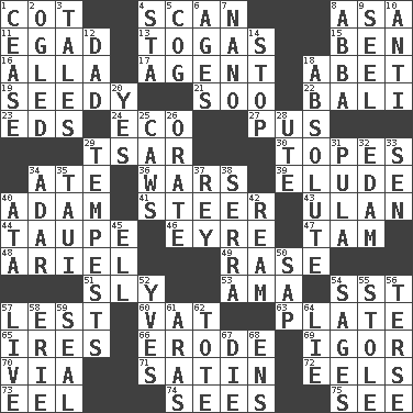 ACROSS 1. Small bed 4. Examine hastily 8. White ___ sheet 11. Mild oath 13. Ancient Roman robes 15. Benjamin's nick name 16. Silent film actress Nazimova 17. Rep 18. Collude with 19. Full of seeds 21. "Barney Miller" actor Jack 22. Indonesian resort city 23. Begley and Asner 24. Environmental prefix 27. Ichor 29. Russian ruler of old 30. Drinks excessively 34. Had dinner 36. Armed conflicts 39. Dodge 40. First of billions? 41. Bull 43. ____ Bator, Mongolia 44. Grayish beige 46. Jane of fiction 47. Scottish cap 48. Satellite of Uranus 49. To erase 51. Wily 53. Nursemaid (var.) 54. Fast jet (abbr.) 57. For fear that 60. Large container 63. Food holder 65. Angers 66. Wear away 69. Russian composer Stravinsky 70. By way of 71. Smooth fabric 72. Snakelike fish 73. Snakelike fish 74. Perceives with the eye 75. Perceive with the eye DOWN 1. Desist 2. Stared 3. Lies 4. R.R. building 5. Gear tooth 6. Eons 7. Billionth: prefix 8. Swedish rock group 9. Stitch closed the eyes of (a falcon) 10. Opposed to 12. Male parent 14. Halt 18. Utter; complete 20. Affirmative reply 25. Crow sounds 26. Declaim 28. Shoshoni 29. Storms 31. Monetary unit of Botswana 32. Dutch treat 33. Elected rep. 34. The sixth month of the Jewish calendar 35. "Change" in Tahitian 37. Marina Del _, California 38. Father Junipero _ 40. _ moment's notice (2 wds.) 42. 480, 500 or 516 sheets of paper 45. Pipe bend 50. Plant excrement 52. Jacques Cousteau's middle name 54. Gurus 55. Fur scarf 56. Laconic 57. Moving, as bait 58. 4th largest of the Great Lakes 59. Lick closed 61. Caspian sea tributary 62. Carry 64. Whopper 67. Expire 68. Followers of ems