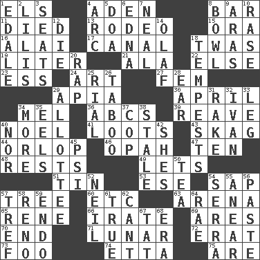 ACROSS 1. Raised railways 4. Arabian gulf 8. Long, evenly shaped piece 11. Passed on 13. Cowboy competition 15. Mouth or opening 16. Jai ____ 17. Lessep's creation 18. It was, poetically 19. 61 cubic inches 21. In the manner of 22. Otherwise 23. Curvy letter 24. Nonscientific branch of learning 27. Opposite of masc. 29. Capital of Western Samoa 30. Showery time 34. Cartoonist voice _ Blanc 36. Lettered men learn these first 39. Break or tear apart 40. Christmas carol 41. Plunders 43. Heroin 44. Fourth or lowest deck 46. Brightly colored fish 47. Nine, plus one 48. Musical pauses 49. Allows 51. Metal container 53. Compass dir. 54. Plant excrement 57. Woody plant 60. And so on (abbr.) 63. Sports stadium 65. French philosopher Descartes 66. Feeling or showing extreme anger 69. Ancient Greek god of war 70. Conclusion 71. Type of eclipse 72. Part of Q.E.F. 73. Egg _ yung 74. Singer James 75. "We ___ not amused" (Victoria) DOWN 1. Peak District village in England 2. Ms. Damita and namesakes 3. Theater features 4. Curve 5. ___ good deed 6. Pulitzer Prize-winning author Ferber 7. Actress Patricia 8. Soup holder 9. Ancient river in northeast Turkey 10. To erase 12. Pass on 14. Norwegian king 18. Storms 20. Reproach for some lapse or misdeed 25. Monetary unit of Yemen 26. Off limits 28. Hearing organ 29. One to whom something is allotted 31. Immoral or dissolute person 32. "Terrible" tsar 33. Part of a journey 34. Greater amount 35. Snakelike fish 37. Police officer (slang) 38. Lacking originality or spontaneity 40. And not 42. "______ My Girl" (Turtles hit) 45. 23rd letter of the Greek alphabet 50. Beverage made from leaves 52. Famous astronaut Armstrong 54. Father Junipero _ 55. Approach 56. Thick mixture 57. Unclean, religiously 58. Western Nevada city 59. Inside; within (prefix) 61. Loyal 62. Patter 64. Actress Charlotte 67. Make lace 68. Epoch
