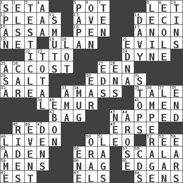 ACROSS 1. Bristle 5. Plant holder 8. Allow 11. Entreaties 13. "___ Maria" 14. Tenth: prefix 15. Indian state 16. Fenced enclosure 17. Soon (poet.) 18. Fish or hair follower 19. ____ Bator 21. Vices 22. "Tell ____ the Marines!" 24. Unit of force 25. Buttonhole 27. Car or cant ending 29. Table seasoning 30. Ferber et al. 32. Length times width 33. Collect or gather 35. Lie 39. Arboreal primate 41. Presage 42. Container for groceries 43. Slept 45. Redecorate 48. Celtic language 49. Make or become more lively 50. Butter sub 52. To sift 55. Arabian gulf 56. Period 57. Any of the three canals of the cochlea 59. Not women's 60. Tired old horse 61. _ Allan Poe 62. Eastern Standard Time (abbr.) 63. Raised railways 64. Elected reps. DOWN 1. Connect, as a bridge 2. Otherwise 3. One of the two male reproductive glands 4. Auto club (abbr.) 5. Dad 6. Baking chamber 7. Nine, plus one 8. Soviet premier 1918-24 9. Learning spot: Fr. 10. Canisters 12. Obscenities 14. American folk hero Crockett 20. Car dealer's back yard 21. Pulitzer Prize-winning author Ferber 23. "_____ Recall" 25. White ___ sheet 26. 4-wheeled motor vehicle 27. Begley and Asner 28. Followers of ems 30. Hearing organ 31. Ceases 33. Wet nurse (var.) 34. Java container 36. Electrical Measurement 37. Area sheltered from the wind 38. Conclusion 40. Inky black, to poets 43. Born 44. Came up 45. Amusement-park features 46. Incident 47. Hiding places for outlaws 49. Unable to walk 50. Spoken 51. Fails to keep up a pace 53. Flair 54. Hearing organs 56. Compass dir. 58. Music discs