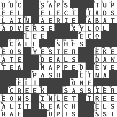 ACROSS 1. English channel? 4. Plant excrements 8. Uncastrated adult male sheep 11. Snakelike fish 12. Voters do this 14. Small boys 15. (Had) reclined 17. Nest on high 18. Blind as ____ 19. Contrary to your interests or welfare 21. Xylene (variant) 23. Area sheltered from the wind 24. Environmental prefix 25. Give a ring to 27. "______ My Girl" (Turtles hit) 30. Greek goddess of the dawn 31. Last 34. Make supply last 37. Had dinner 38. Allots cards 39. Obsolete 40. Beverage made from leaves 41. Slept 43. Night before a holiday 44. Romantic infatuation 45. Inactive volcano in Sicily 47. Biblical high priest 49. Single 50. Small stream 52. More lively and spirited 56. Immeasurably long periods of time 57. An arm off of a larger body of water 60. Relationship diagram 61. Set down 62. Arrive at 63. Raised railways 64. Actress Charlotte 65. Elects 66. Fast jet (abbr.) DOWN 1. Actor Lugosi 2. Necklace unit 3. 154 in Roman numerals 4. Gospel singer Marvin 5. Toward shelter 6. For each 7. _-fi 8. Off limits 9. Freehold land 10. Pacific Standard Time (abbr.) 13. John Ritter's dad 14. Baby powder 16. 1994 drama film starring Jodie Foster 20. Have confidence or faith in 22. Affirmative reply 25. ____ d'Azur (French Riviera) 26. At sea 27. Staphylococcus 28. Aid 29. Celtic language 30. Ingest 32. Pulitzer Prize-winning author Ferber 33. Oceans 34. Locale of original sin 35. Polynesian shrub of the pepper family 36. She-sheep 42. Hiding places for outlaws 44. Sliced dessert 46. Trial 47. Bert's buddy 48. For fear that 49. Profane or obscene expressions 50. Root beer relative 51. Apertif with cassis 52. Religious group 53. Angers 54. Snakelike fish 55. Relief 56. Ewer handle 58. Modern: prefix 59. Infant locale