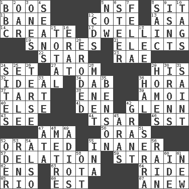 ACROSS 1. Scornful sounds 5. Science/research agcy. 8. Be seated 11. Object of repulsion 12. ____ d'Azur (French Riviera) 13. White ___ sheet 14. Cause to be 17. Residence 19. Sounds asleep 21. Opts 22. Play the lead 23. Actress Charlotte 24. Arrange properly for use 27. Tiny particle 29. Part of HMS, perhaps 32. Standard of perfection 34. Apply (a substance) by light strokes 36. Israeli folk dance 37. Small pie 38. Compass dir. 39. Mine, in Marseilles 40. Otherwise 41. Lair 42. American astronaut and politician John 43. Observe 44. Russian ruler of old 46. Fast jet (abbr.) 47. Nursemaid (var.) 50. Mouths or openings 52. Declaimed 55. More empty; more void 57. Accusation by an informer 59. Put through a sieve 62. Followers of ems 63. Round or rotation of duties 64. Travel on or in a vehicle 65. River (Sp.) 66. Eastern Standard Time (abbr.) 67. Afresh DOWN 1. English channel? 2. Rowing implement 3. Singles 4. Seines 5. At this time 6. Navigate 7. Man or boy (slang) 8. Ketch in the Levant 9. Is not 10. Labels 12. Music discs 15. Add up to 16. Part of Q.E.F. 18. Area sheltered from the wind 20. Eaten away 24. Settings 25. Peak District village in England 26. Laconic 28. French painter Edouard 29. Dwellings 30. Metal shackles 31. Virtuous person 33. Had dinner 35. Gillaume's butler role 36. Actor Linden 42. Let have 45. Ancient river in northeast Turkey 47. "One Day ___ Time" 48. Distance measurement (Brit.) 49. Goodbye (Sp.) 51. Father Junipero _ 52. River in Europe 53. Painter Guido (1575-1642) 54. In addition 55. _ tizzy (2 wds.) 56. Water falling in drops from the sky 58. Baseball player Mel 60. Binary compound 61. ___ Haven, CT