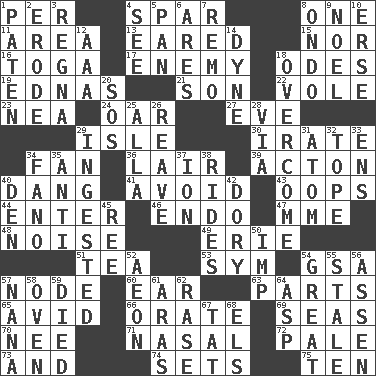 ACROSS 1. For each 4. Practice fight 8. Single 11. Length times width 13. Having ears or earlike features 15. Not either 16. Ancient Roman robe 17. Foe 18. Lyric poems 19. Ferber et al. 21. Male offspring 22. Grand slam 23. Teachers' org. 24. Rowing implement 27. First lady 29. Small island 30. Feeling or showing extreme anger 34. Avid follower 36. Den 39. 13-14th century defensive garment 40. Mild oath, euphamism for damn 41. Stay clear from 43. I made a mistake 44. Keyboard key 46. Inside; within (prefix) 47. Madame (abbr.) 48. Annoying sound 49. One of the Great Lakes 51. Beverage made from leaves 53. Symbol (abbr.) 54. Girls' org. (abbr.) 57. Connecting point 60. Hearing organ 63. Actors' quests 65. Enthusiastic 66. Speak pompously 69. Oceans 70. Born 71. Relating to the nose 72. Light colored 73. Also 74. Arranges properly for use 75. "___ Little Indians" DOWN 1. Eucharist need 2. Wear away 3. Rain (Swedish) 4. Observe 5. Baking dish 6. Ancient Greek god of war 7. San ____ (Riviera town) 8. Southwest Nigerian state 9. Christmas carol 10. Celtic language 12. American Automobile Association (abbr.) 14. Unit of force 18. Conquer 20. Mayday 25. Silent film actress Nazimova 26. Rob, plunder, or pillage 28. By way of 29. Swallowed 31. Smallest unit of an element 32. Drink excessively 33. Followers of ems 34. Papal veil 35. Opposed to 37. Electrically charged atom 38. Amusement-park features 40. Lair 42. Dinghy 45. Portuguese money of account (variant) 50. Naughty child 52. Age 54. Relatively large 55. Having lost freshness 56. NE Netherlands city 57. Grandmother 58. Baking chamber 59. Passed on 61. Caspian sea tributary 62. Raze (variant) 64. Cleo's killer 67. Make lace 68. Raised railways