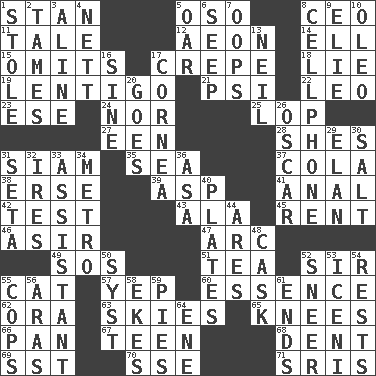 ACROSS 1. Comedian Laurel of Laurel & Hardy 5. Bear (Spanish) 8. Corporate head (abbr.) 11. Lie 12. Period of immesurable duration 14. Pipe bend 15. Leaves out 17. Streamer paper 18. Untruth 19. Small, flat, pigmented spot on the skin 21. 23rd letter of the Greek alphabet 22. Lion 23. Compass dir. 24. Not either 25. Trim (branches) 27. Car or cant ending 28. "______ My Girl" (Turtles hit) 31. Thailand, formerly 35. Ocean 37. Root beer relative 38. Celtic language 39. Cleo's killer 41. Of or related to the anus 42. Trial 43. In the manner of 45. Monthly bill 46. SW Saudi Arabia district 47. Curve 49. Distress signal 51. Beverage made from leaves 52. Title for a knight 55. Feline 57. Slangy assent 60. Center 62. Mouth or opening 63. Atmospheres 65. Leg joints 66. Baking dish 67. Adolescent 68. Scratch 69. Fast jet (abbr.) 70. Compass dir. 71. Indian titles of respect DOWN 1. Took without asking 2. Makes less strong or intense 3. Place in a line 4. Remaining after all deductions 5. Rowing implement 6. Ooze 7. I made a mistake 8. Portable communications device 9. Writer Wiesel 10. Butter sub 13. Famous astronaut Armstrong 16. Trig term 17. Pupil covering 20. Leaves 26. Witty Wilde 29. Liveliness 30. Table seasoning 31. Stalk of a moss capsule 32. Angers 33. Aide 34. Paris' subway 36. White ___ sheet 40. Food holders 44. Ancient Greek god of war 48. Keg 50. System (abbr.) 52. Contemptuous expression 53. Ancient Celtic tribe of eastern Britain 54. Musical pauses 55. 911 reaches them 56. Caspian sea tributary 58. Makes supply last 59. Sliced desserts 61. Extremities 64. Compass dir.