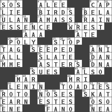 ACROSS 1. Mayday 4. Toward shelter 8. Head covering 11. Untruth 12. Avian creatures 14. Actor Lugosi 15. Uhlan (variant) 17. Collect or gather 18. Precipitation 19. Substance 21. Take or capture by force 23. Auto club (abbr.) 24. Had dinner 25. Many (prefix) 27. Cease 30. Label 31. Oozed 34. Black tropical American cuckoo 37. 100% 38. Schedule 39. One of the 12 tribes of Israel 40. Madame (abbr.) 41. Michaelmas daisies 43. Heredity factor (abbr.) 44. Institutes legal proceedings 45. In addition 47. Make imperfect 49. Medical imaging device (abbr.) 50. Soviet premier 1918-24 52. Sycophants 56. Printing process, for short 57. Olfactory organs 60. Three-handed card game 61. Merit 62. _____ Park, CO 63. Bear (Spanish) 64. Compass dir. 65. Papal veil 66. Teachers' org. DOWN 1. Turn sharply 2. Petroleums 3. Oceans 4. Phillipine bananalike plant 5. Welles in "The Third Man" 6. Epoch 7. Begley and Asner 8. Desist 9. Set down 10. Baking dish 13. Compass dir. 14. Cy Young winner Saberhagen 16. Anneal 20. Negative votes 22. Reproach for some lapse or misdeed 25. Inside of hand 26. Stare 27. Arguments over trivial matters 28. Wig 29. River in Europe 30. Scottish cap 32. Son of Isaac 33. Otherwise 34. Sums up 35. Billionth: prefix 36. _ tizzy (2 wds.) 42. "Two Mules for Sister ____" 44. Indian title of respect (Mr.) 46. Flaplike coverings 47. Distance measurement (Brit.) 48. Soon (poet.) 49. With motion or animation 50. Grant temporary use of 51. Compass dir. 52. Adolescent 53. Picture 54. Relaxation 55. Portico 56. To sift 58. Order of Saint Francis (abbr.) 59. R.R. building
