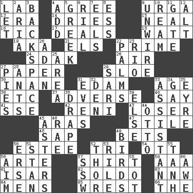 ACROSS 1. Experiment locale 4. Match 9. Capital and largest city of Mongolia 13. Period 14. Frees from moisture 15. Anneal 16. Nervous spasm 17. Allots cards 18. Electrical Unit 19. Alias (abbr.) 21. Raised railways 22. First class 24. Neighbor of Neb. 26. Atmosphere 27. Some stationery 29. A type of plum 30. Lacking in sense or substance 31. Dutch treat 33. Grow older 36. And so on (abbr.) 37. Contrary to your interests or welfare 40. Declare 41. Compass dir. 42. Painter Guido (1575-1642) 43. Failure 45. Caspian sea tributary 47. Vertical member of a panel or frame 48. Plant excrement 49. Antes 50. First name in cosmetics 52. Three (prefix) 54. Baseball player Mel 56. Johnson of "Laugh-In" 57. Upper-body garment 59. American Automobile Association (abbr.) 61. Austrian river, tributary to the Danube 62. Twentieth part of a lira 63. Compass dir. 64. Not women's 65. Take or capture by force 66. Definite Article DOWN 1. Allow 2. Roberta Peters solo 3. Keyboard key 4. Say or write further 5. Of Greece 6. Monetary unit of Yemen 7. Snakelike fish 8. Double-curved letter 9. Undo the wiring of 10. 480, 500 or 516 sheets of paper 11. Yard entry 12. The first octave above the treble staff 20. An important port of Yemen 22. Insides of hands 23. _ de Janeiro 25. Length times width 27. Sliced desserts 28. Pismires 29. Indian skirt 31. Nights before holidays 32. Lair 33. Helper 34. Highlander 35. Jane of fiction 38. Window treatment 39. Otherwise 44. "Beetle Bailey" pooch 45. Michaelmas daisies 46. Actress Charlotte 49. Avian creatures 50. Celtic language 51. Comedian Laurel of Laurel & Hardy 52. Son of Odin 53. Cause heat under the collar 55. Hyperbolic tangent 56. Direct toward a target or goal 57. Compass dir. 58. Small child 60. Deep reverence
