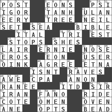ACROSS 1. Mail 5. Immeasurably long periods of time 9. 23rd letter of the Greek alphabet 12. Composer Stravinsky 13. Hyperbolic tangent 14. ____ Bator 15. Suggestive of the supernatural 16. Family _ (genealogy) 17. Famous astronaut Armstrong 18. Put into a specified state 19. Ocean 21. Instruction Manual for Humans 22. Slanted text style (abbr.) 24. Three (prefix) 26. Eastern Standard Time (abbr.) 27. Closes up, plugs up 28. "______ My Girl" (Turtles hit) 29. Den 30. Bert's buddy 32. Olfactory organ 36. Greek god of love 37. Period of immesurable duration 38. One who makes use of a thing 39. Pig sound 40. Match 42. Inactive volcano in Sicily 43. Is not 44. All-night dance parties 46. Deep reverence 49. Numbers guy (abbr.) 50. At once, immediately (arch.) 51. Indian princess (variant) 53. It would 54. Title for a knight 57. SW Asia republic 58. Papal veil 61. Travel on or in a vehicle 62. ____ d'Azur (French Riviera) 63. Sign of things to come 64. Baking chamber 65. One (Scot) 66. Chooses 67. Necklace unit DOWN 1. Sliced desserts 2. Double curve, resembling the letter S 3. Determination 4. Attempt to accomplish something 5. Singer James 6. Boat paddle 7. Compass dir. 8. A female animal or person 9. Cadet 10. Travel by water 11. An arm off of a larger body of water 14. University (slang) 19. Plant excrement 20. Otherwise 21. Twice 23. Cod relative 24. One or ones belonging to thee 25. To riddle 27. Indian skirt 28. Derisive sound 29. Lion 31. Rain (Swedish) 32. New (sp.) 33. Clearly or manifestly demonstrative 34. Elected reps. 35. Period 40. Viper 41. Part of Q.E.F. 43. Frozen water 45. Also 46. N. Chile seaport 47. Make _____ (do battle with) 48. Maternal 52. Compass dir. 53. Charged particles 55. The content of cognition 56. Tear apart 58. Egg _ yung 59. Electrical Unit 60. Fish or hair follower 61. Director Reiner