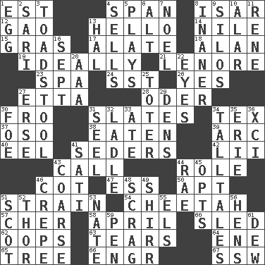 ACROSS 1. Eastern Standard Time (abbr.) 4. Connect, as a bridge 8. Austrian river, tributary to the Danube 12. E Mali city 13. Phone greeting 14. Mediterranean tributary 15. Pate de foie ____ 17. Having winglike extensions 18. ____ Jay Lerner 19. Under perfect conditions 21. Poe poem 23. Health resort 24. Fast jet (abbr.) 26. Affirmative reply 27. Singer James 28. River in Europe 30. Away 31. Chalkboards 34. John Ritter's dad 37. Bear (Spanish) 38. Consumed 39. Curve 40. Snakelike fish 41. Spring feasts 42. Cards in a Roman deck? 43. Give a ring to 44. Hero or heavy, e.g. 46. Small bed 47. Curvy letter 50. Fitting 51. Put through a sieve 54. Leopard's kin 57. "Mermaids" star 58. Showery time 60. Downhill vehicle 62. I made a mistake 63. Pulls apart 64. Compass dir. 65. Relationship diagram 66. Engineer (abbr.) 67. Compass dir. DOWN 1. Ovum 2. Indian skirt 3. Inedible or poisonous agaric 4. Makes a sale 5. Live dramatic performances 6. Keyboard modifier key 7. Christmas carol 8. Sillier 9. Grain storage towers 10. Having or resembling wings 11. French philosopher Descartes 13. Actor Linden 16. Back-to-school mo. 20. American Automobile Association (abbr.) 22. Sight organs 25. Carrier 27. Celtic language 29. Habitations of wild animals 30. Enemy 31. Sew up the eyelids of hawks and falcons 32. Dipping utensil 33. Had dinner 34. Baron Munchausen's specialties 35. One of the Great Lakes 36. One more than ninety 41. Suttee (variant) 43. Unrefined 44. Actress Charlotte 45. Chooses 46. Streamer paper 48. Lean end of the neck 49. Bake eggs in their shells 51. Highlander 52. Son of Odin 53. Nathan's nickname 55. Raised railways 56. Coop moms 59. Fenced enclosure 61. Morning condensation